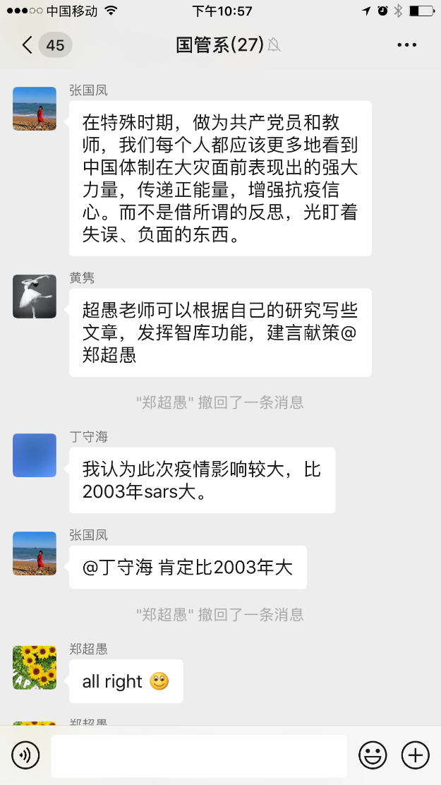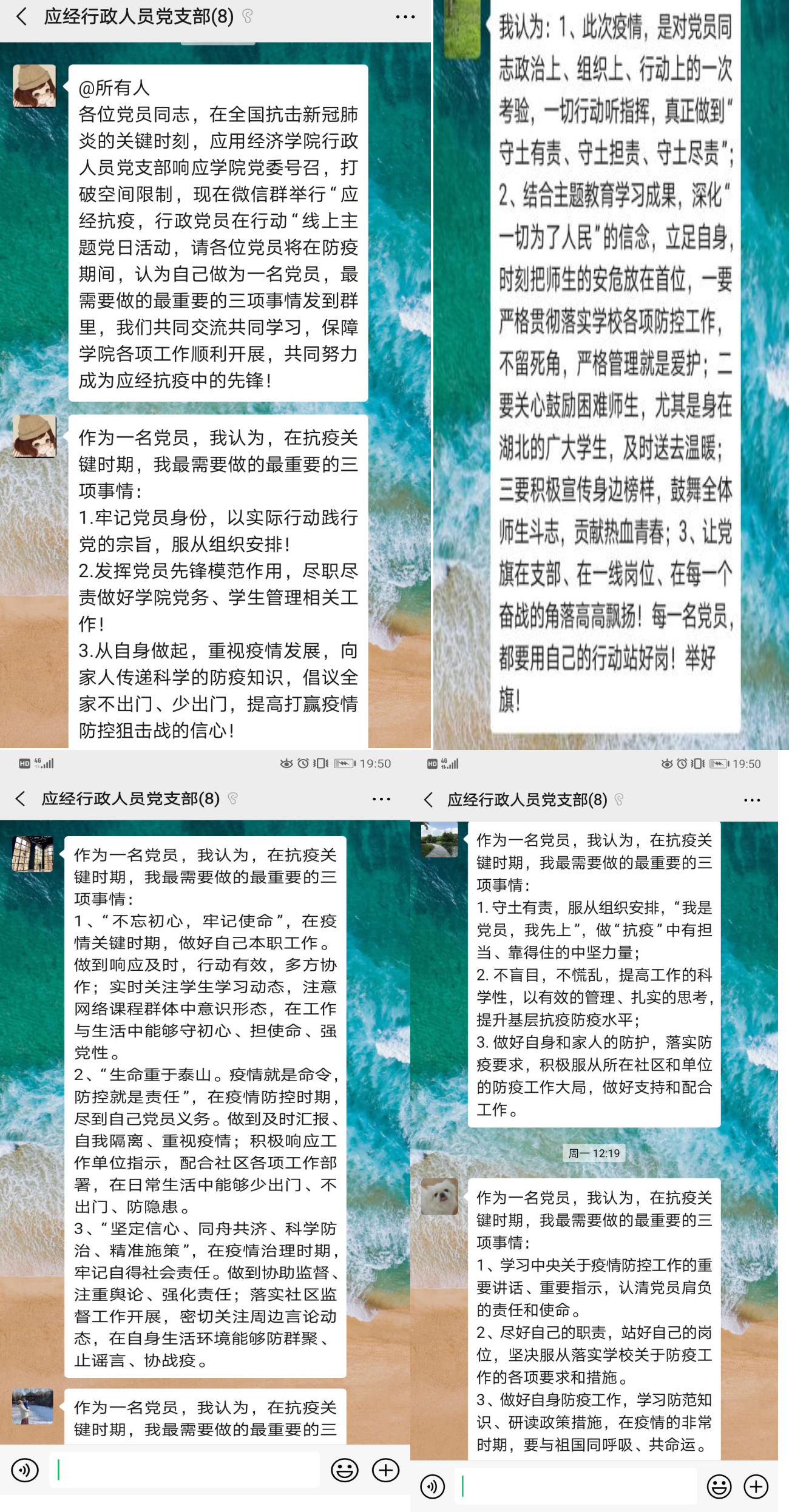 2月25日,在全国抗击新冠肺炎的关键时刻,新葡京官网 行政人员党支部响应新葡京官网 党委号召,打破空间限制,在微信群中开展“应经抗疫,行政党员在行动”线上主题党日活动,全体党员参与本次活动。每位党员都结合自己的工作和生活谈了自己的认识与感触,共同交流共同学习,保障新葡京官网 各项工作顺利开展,共同努力成为应经抗疫中的先锋。大家纷纷发言,众志成城,希望用实际行动为新葡京官网 、为学校、为国家的防疫工作做出应有的贡献!