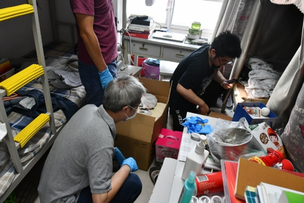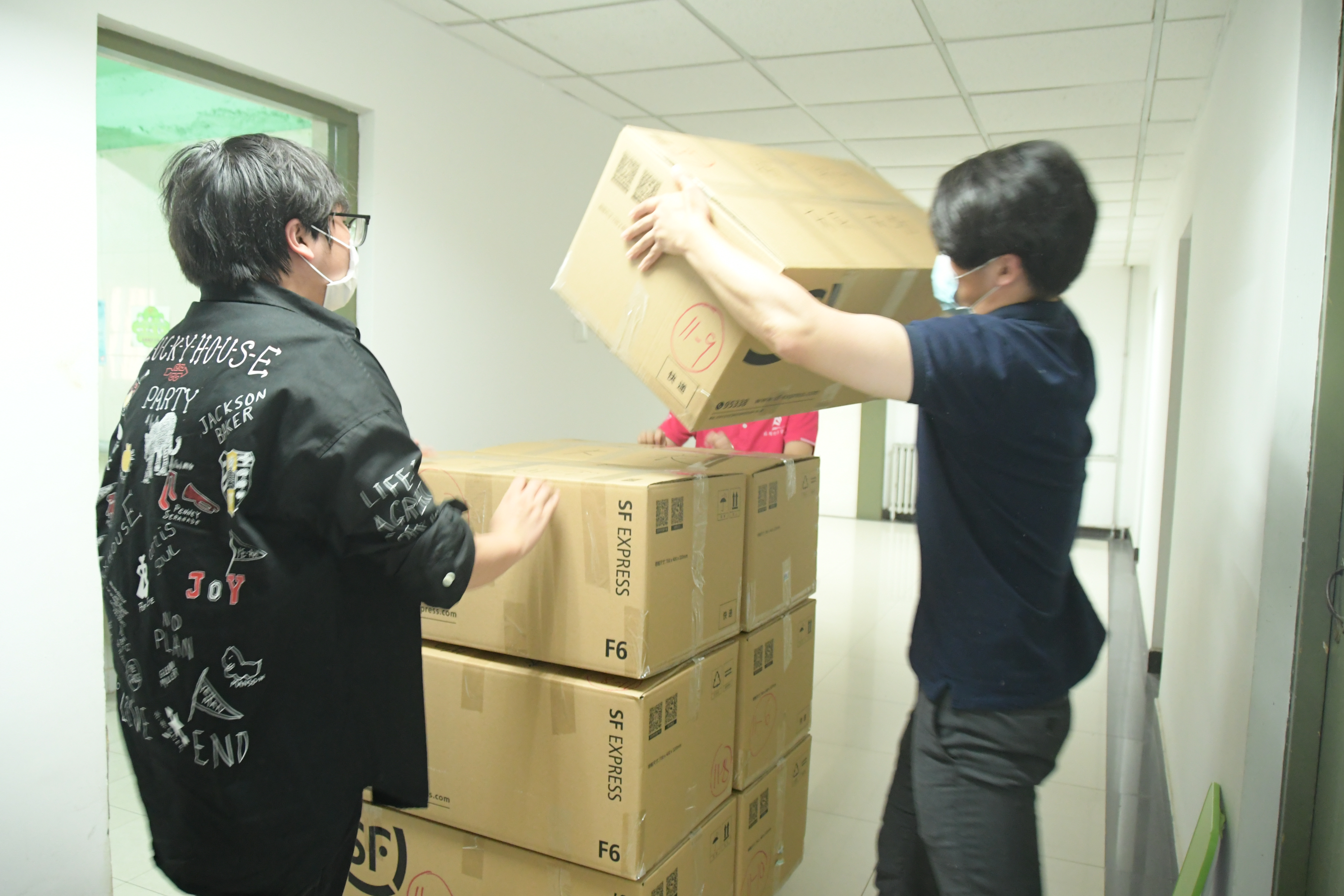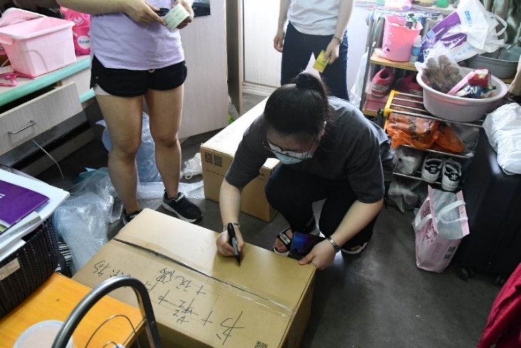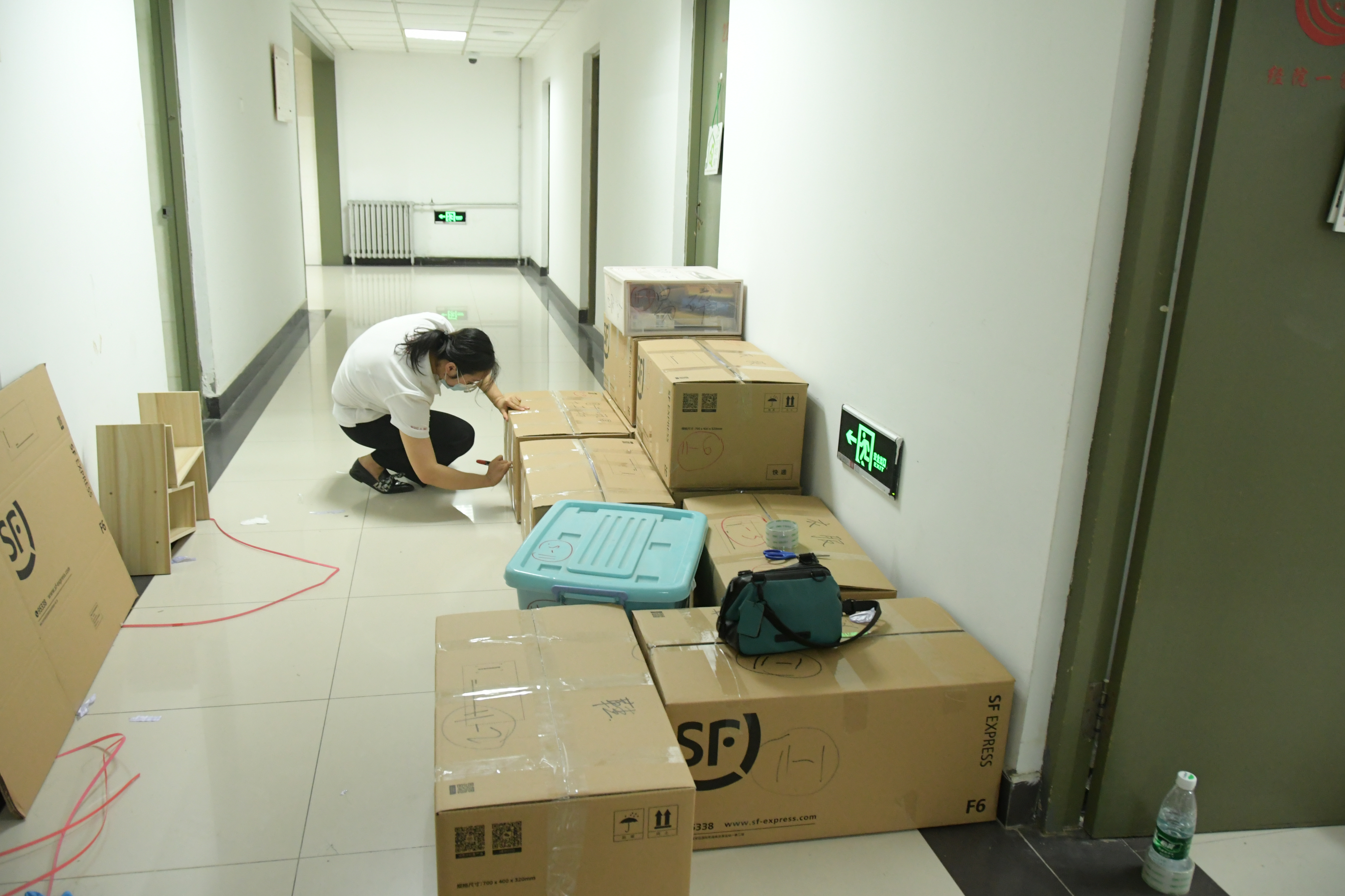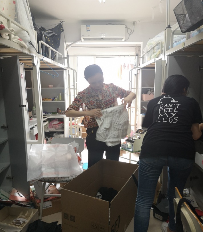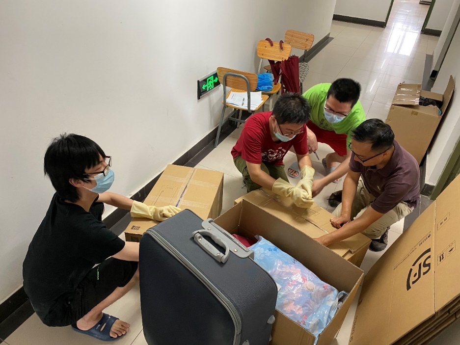 这样的对话重复着一遍又一遍。师生志愿小队一会整理着东西,一会又穿梭于走廊不停地搬运行李。夏天佩戴起口罩更加闷热,但他们也顾不上这些了——整理、打包好一位学生的包裹之后,又开始和另一位学生视频连线、整理物品、打包……