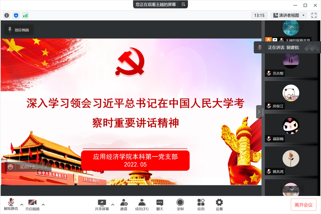 4月25日,习近平总书记来到中国人民大学考察调研,并发表重要讲话。新葡京官网 第一时间开展各类学习活动,组织全体党员观看新闻联播,新葡京官网 党委理论学习中心组开展专题学习,组织党支部参观学校博物馆专题展览、广泛动员党员撰写学习心得等。按照学校统一部署,5月10日前,新葡京官网 全体党支部召开专题学习活动,学习领会习近平总书记在中国人民大学考察时重要讲话精神。新葡京官网 党委理论学习中心组成员均深入基层党支部,一级带着一级学,主动参加基层党支部专题学习活动,实现基层党支部宣讲、学习全覆盖,迅速掀起学习习近平总书记重要讲话精神的热潮。