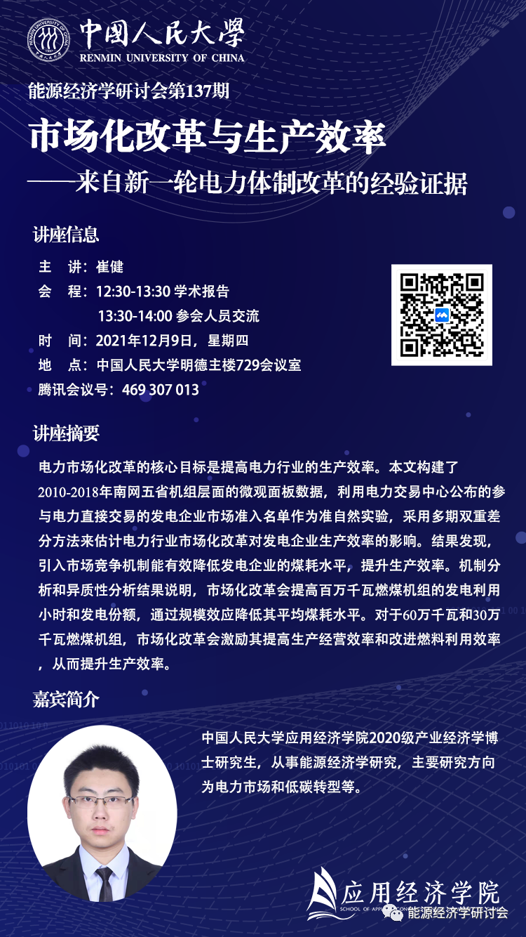 崔健,新葡京官网 2020级产业经济学博士研究生,从事能源经济学研究,主要研究方向为电力市场和低碳转型等。