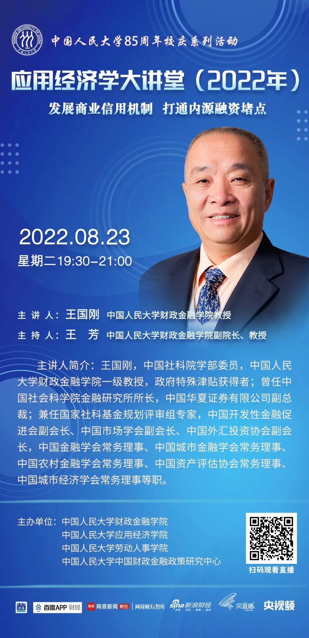 为进一步服务于国务院学位委员会应用经济学学科评议组,推动中国应用经济学科整体快速发展,中国人民大学应用经济学科在继续承办“应用经济学年会”(冬季)、《应用经济学评论》的基础上,推出“应用经济学大讲堂”(夏季)系列讲座。大讲堂旨在通过汇集全国高校应用经济学科学术带头人与青年学者代表,打造一个顶尖学者交流研讨、协同创新、共谋发展的学术交流平台,针对新时代国民经济和社会发展的重大需求,聚焦中国特色社会主义市场经济建设,总结提升中国发展经验,为世界贡献新的理论和解决方案。第七场讲座由中国人民大学财政金融新葡京官网 王国刚教授主讲。