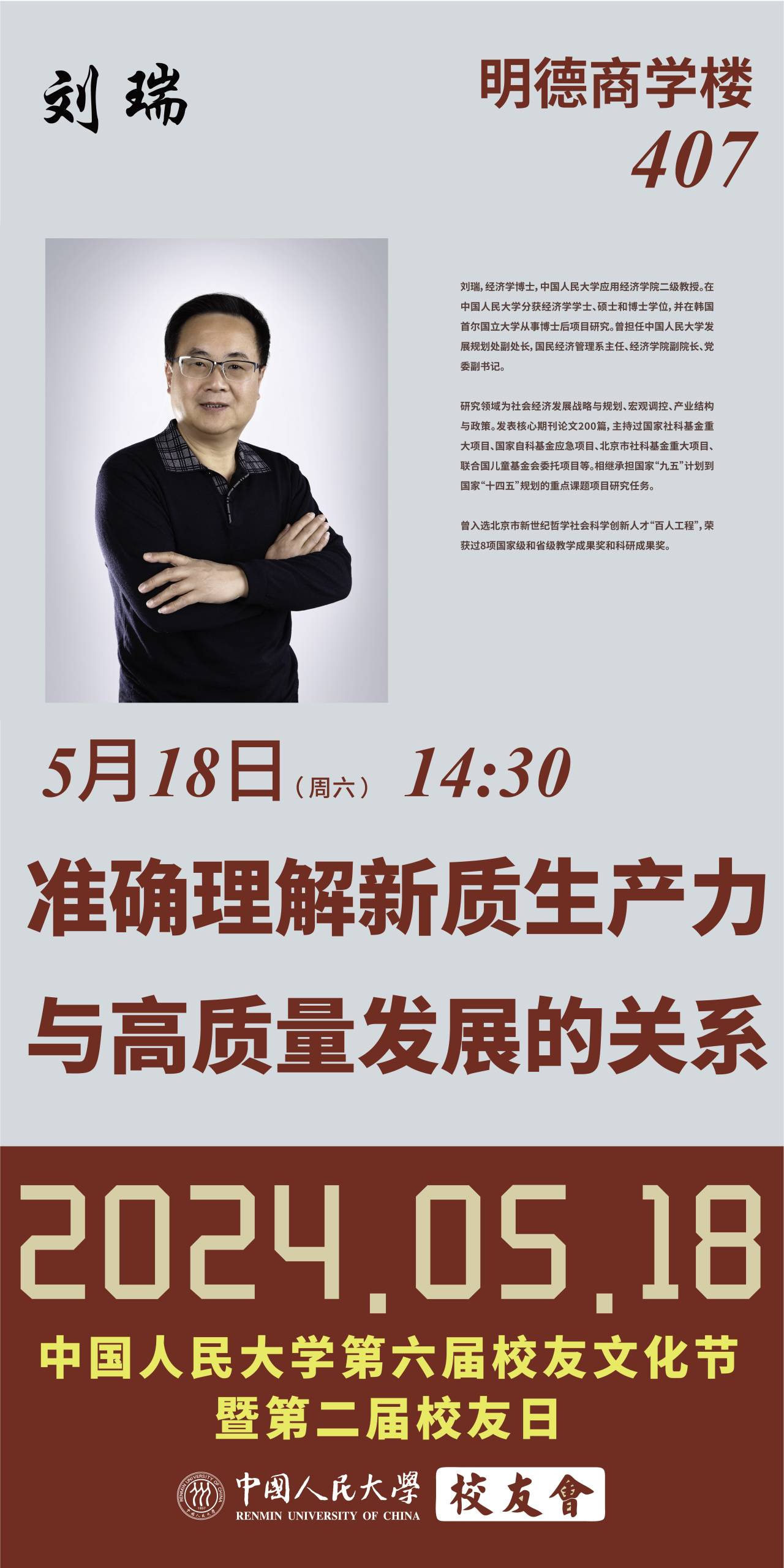 学术公告 当前位置: 新葡京官网 - 学术公告 - 讲座 第六届校友文化节“重返课堂”丨刘瑞教授主讲《准确理解新质生产力与高质量发展的关系》 发文时间: 2024-05-17 阅读次数: 讲座信息 讲座题目 准确理解新质生产力 与高质量发展的关系 主讲人 刘瑞 时间 5月18日(周六) 14:30 地点 明德商学楼407 请各位校友扫描下方二维码 选择课程站点落地 开启您的“重返课堂'之旅 报名通道 来源:中国人民大学校友会 设计 责编:马文林 审核:刘瑞 浩爽