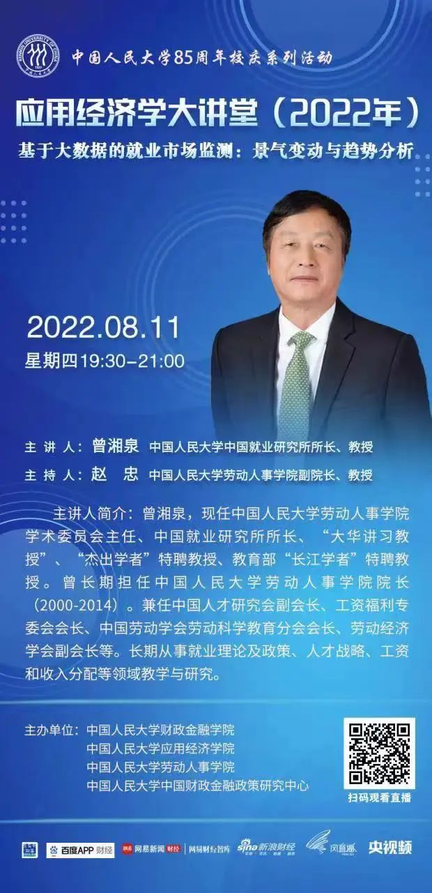 为进一步服务于国务院学位委员会应用经济学学科评议组,推动中国应用经济学科整体快速发展,中国人民大学应用经济学科在继续承办“应用经济学年会”(冬季)、《应用经济学评论》的基础上,推出“应用经济学大讲堂”(夏季)系列讲座,旨在通过汇集全国高校应用经济学科学术带头人与青年学者代表,打造一个顶尖学者交流研讨、协同创新、共谋发展的学术交流平台,针对新时代国民经济和社会发展的重大需求,聚焦中国特色社会主义市场经济建设,总结提升中国发展经验,为世界贡献新的理论和解决方案。第四讲由中国人民大学中国就业研究所所长曾湘泉教授主讲。