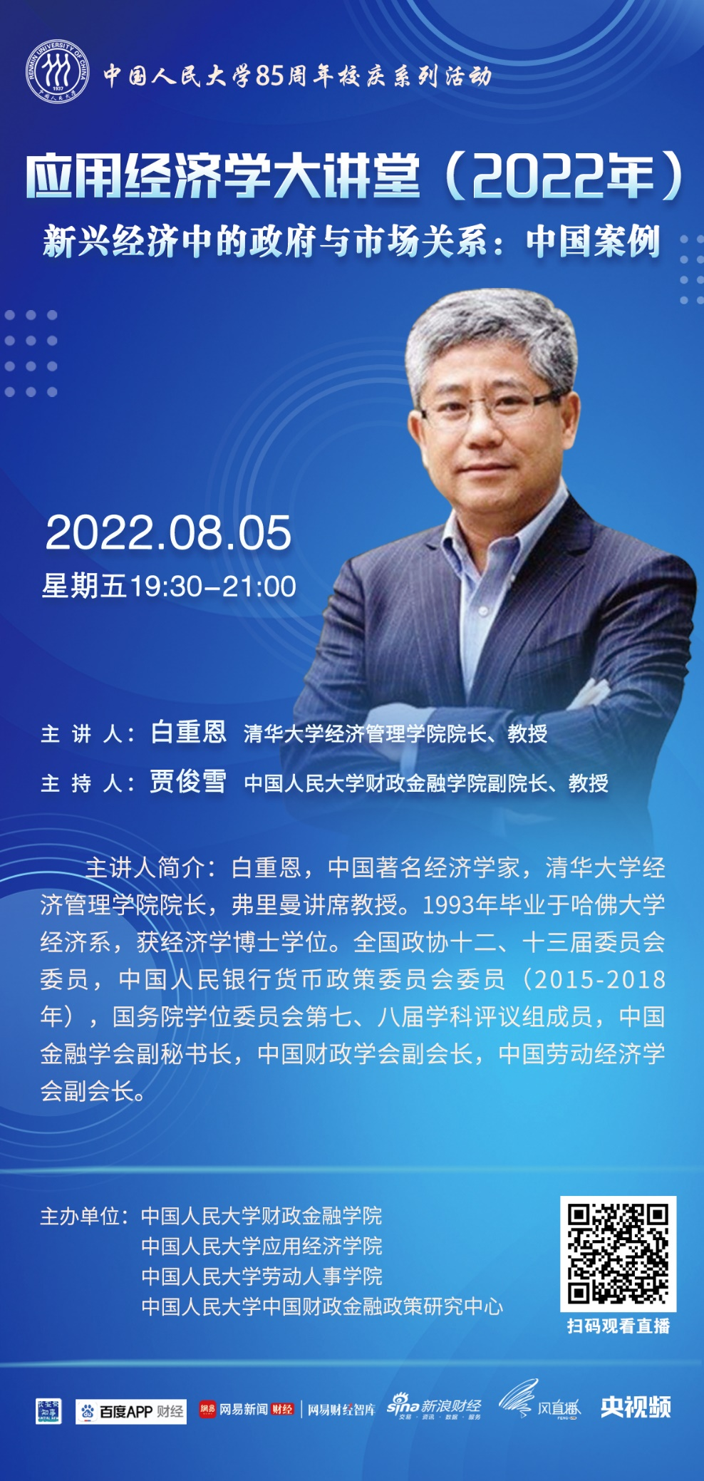为进一步服务于国务院学位委员会应用经济学学科评议组,推动中国应用经济学科整体快速发展,中国人民大学应用经济学科在继续承办“应用经济学年会”(冬季)、《应用经济学评论》的基础上,推出“应用经济学大讲堂”(夏季)系列讲座。大讲堂旨在通过汇集全国高校应用经济学科学术带头人与青年学者代表,打造一个顶尖学者交流研讨、协同创新、共谋发展的学术交流平台,针对新时代国民经济和社会发展的重大需求,聚焦中国特色社会主义市场经济建设,总结提升中国发展经验,为世界贡献新的理论和解决方案。第二场讲座由清华大学经济管理新葡京官网 院长白重恩教授主讲。