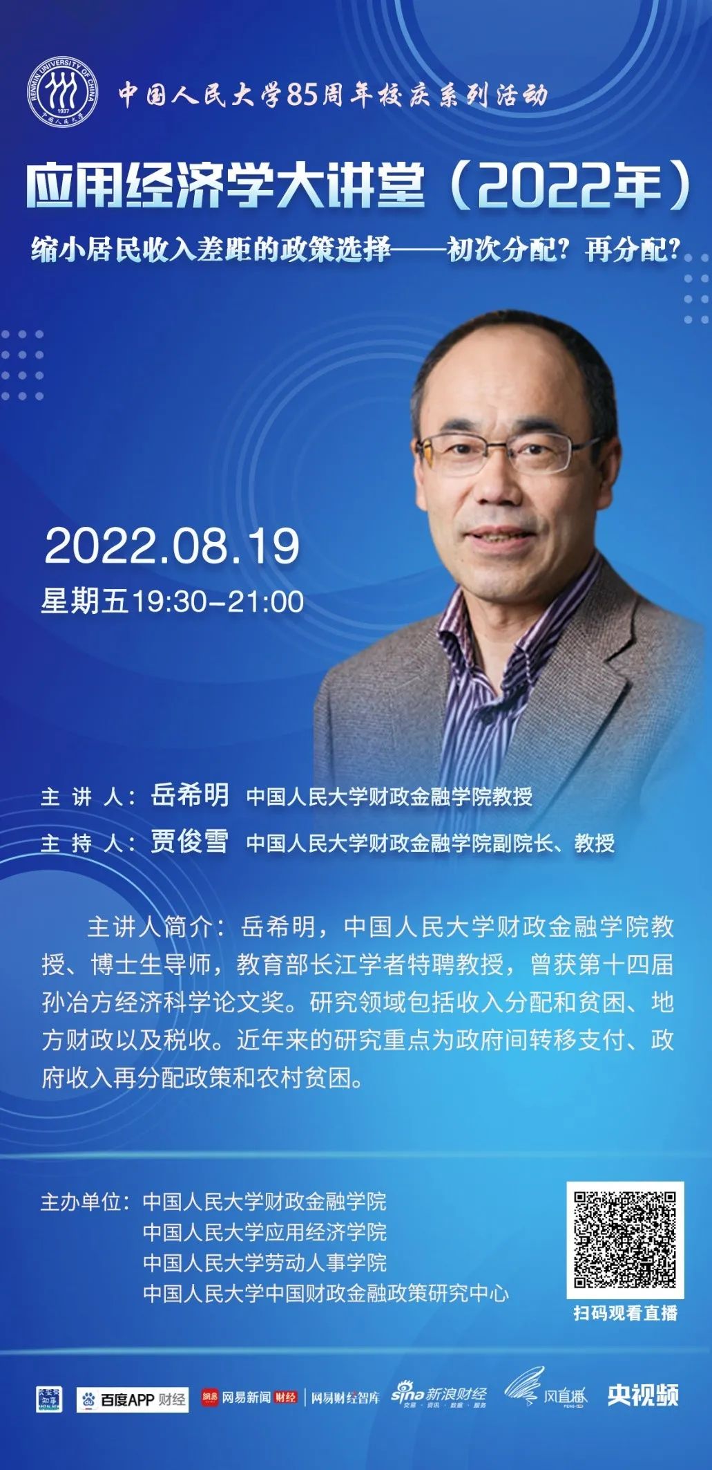 为进一步服务于国务院学位委员会应用经济学学科评议组,推动中国应用经济学科整体快速发展,中国人民大学应用经济学科在继续承办“应用经济学年会”(冬季)、《应用经济学评论》的基础上,推出“应用经济学大讲堂”(夏季)系列讲座。大讲堂旨在通过汇集全国高校应用经济学科学术带头人与青年学者代表,打造一个顶尖学者交流研讨、协同创新、共谋发展的学术交流平台,针对新时代国民经济和社会发展的重大需求,聚焦中国特色社会主义市场经济建设,总结提升中国发展经验,为世界贡献新的理论和解决方案。第六场讲座由中国人民大学财政金融新葡京官网 岳希明教授主讲。
