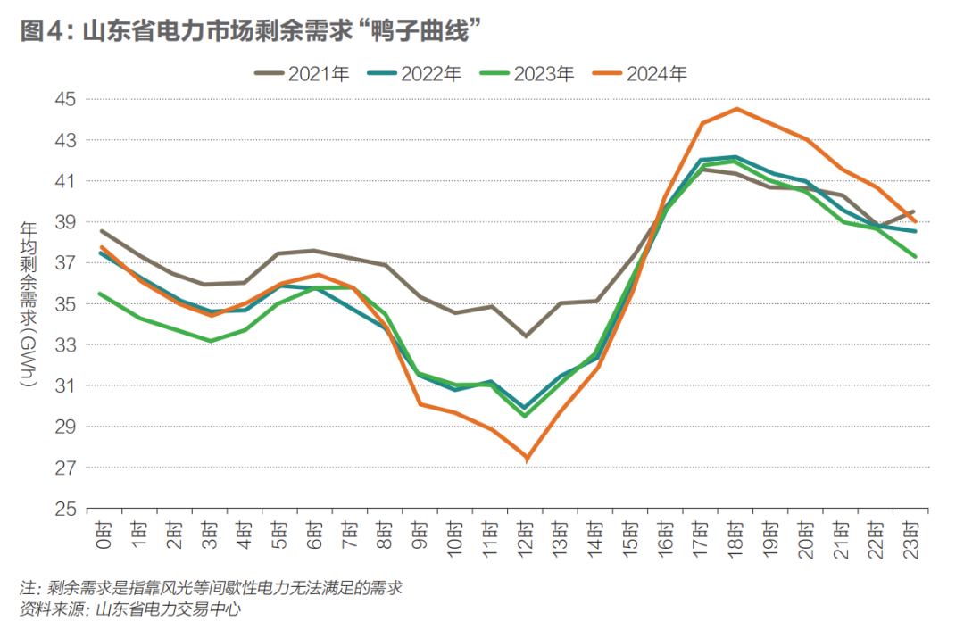 零边际成本特性削弱边际成本定价信号的有效性。随着新能源占比不断提高,电力市场价格形成机制被深刻改变。新能源的边际成本接近零,使得系统出清价格在高比例新能源出力时频繁触底。部分地区现货市场“鸭子曲线”演化为“峡谷曲线”——午间光伏出力高峰时段电价接近地板价,而傍晚光伏出力消失、负荷攀升,火电调峰成本推高电价(见图4,以山东市场为例)。短期看,这种价格波动削弱了价格信号的稳定性;长期看,平均市场价格下行压缩了火电与储能等可调节机组的盈利空间,影响系统投资激励与可靠性。