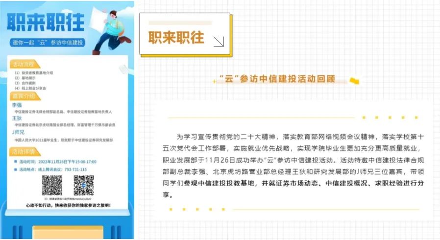 打造“经世导航”“职来职往”系列品牌活动。邀请新葡京官网 优秀校友、相关企业招聘负责人等举办专场活动,为同学们提供岗位和行业咨询指导、帮助同学们探索适合自己的职业发展路径,有效提高同学们的求职技能。