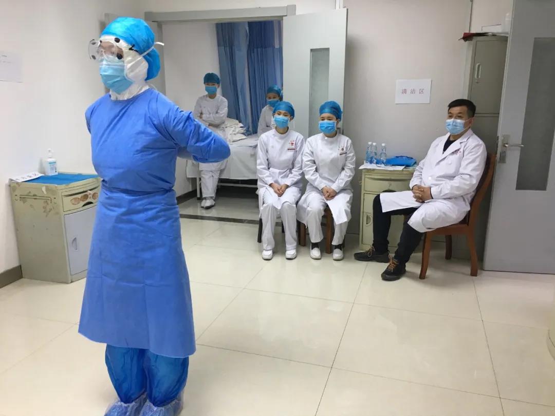在这个特殊时期,除了在医院履行护士的职责外,医院还打造了一支特殊的医疗救治队伍。为保证培训效果,队伍搭建模拟病房,从洗手、戴口罩、穿脱隔离衣等每一个细节入手,全体队员个个全力以赴。所有队员本着“医务人员零感染、更好的服务患者”为目标,他们集体放弃休假,每天早上8点到下午6点利用一切时间进行强化培训和自我学习。在这个过程中,他们要进行数次手卫生,很多队员的手已经泛红、刺痛,但为了防治工作,大家都毫不退缩。