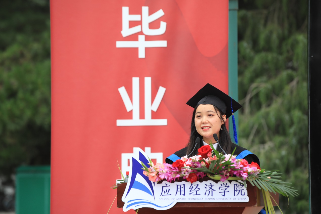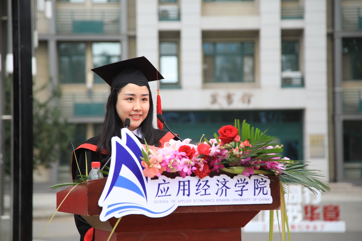 2018级国民经济系马蕊作为硕士毕业生代表发言,表达了对母校的感激之情,并抒发了自己投身西部、建设家乡、回报祖国的理想。她提到,人大精神让她走好选调之路、奉献热情激情于党和人民的心,愈发坚定。
