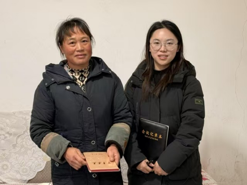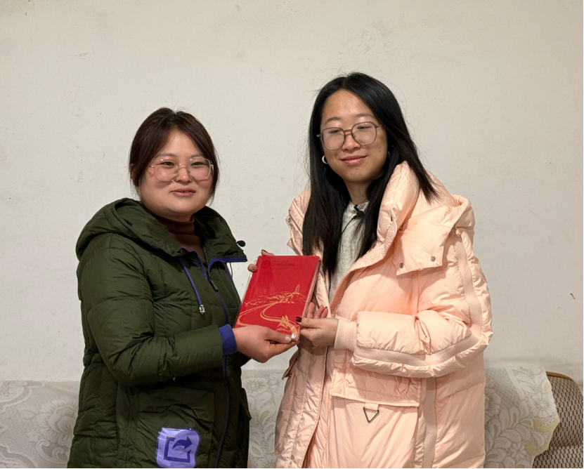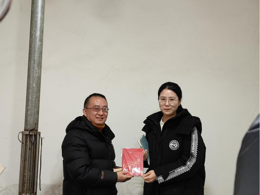▲昭通新葡京官网 管理新葡京官网 本科生代坦访谈脱贫户户主杨开琴后赠书留念
