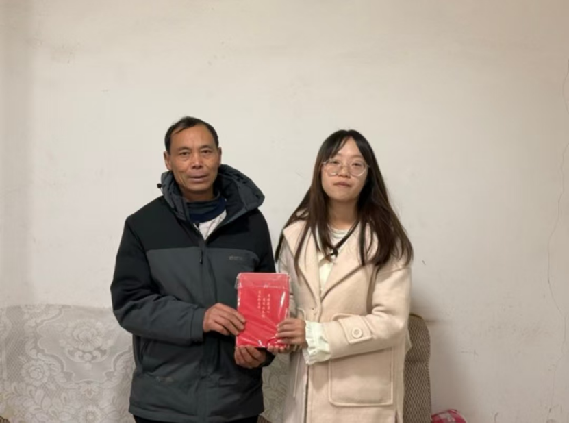 ▲昭通新葡京官网 管理新葡京官网 本科生周恩娜对脱贫户户主潘兴军访谈后赠书留念