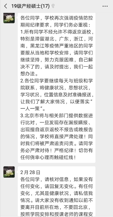 2020年1月下旬从学校回到家中,本以为这是一个与往年类似的寒假的开始。不曾想,没过几天,疫情来势汹汹,多个省份陆续出现了新型冠状病毒肺炎的确诊病例。自全国新型冠状病毒肺炎发生以来,防控新冠肺炎疫情成为了当前头等大事,每日跳动的新增人数,牵动着每个人的心。为阻断疫情向校园蔓延,2020年1月27日,教育部下发通知,要求2020年春季学期延期开学,我知道今年寒假将会成为多年求学生涯中最不平凡的一次。在这样的情况下,一方面新葡京官网 积极安排信息排查,班主任黄滢老师每天都在班级群里认真询问每位同学的情况,关心大家的健康与安全;另一方面,新葡京官网 为新学期每门课都建立了微信群,方便老师与同学们的在线交流,确保“停课不停学”。