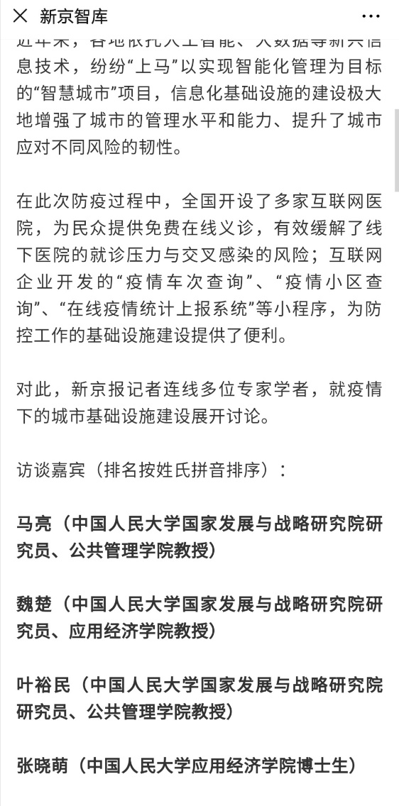 同时,我也关注到互联网等信息技术在疫情防控发挥的独特作用。为缓解医院的运行压力,全国陆续开设了多家互联网医院进行免费线上诊疗,在减轻各地医院就诊压力的同时,也预防了交叉感染的发生;为方便疫情工作的开展,“疫情车次查询”、“疫情小区查询”“在线疫情统计上报系统”等小程序不断被开发、应用;通过微信、微博等互联网媒体,疫情的相关信息得以及时传播,这一切都有赖于我国信息化基础设施的建设。基于这些观察与思考,我与魏楚老师参与了新京报的线上圆桌讨论,就“如何使城市基建最大程度发挥防疫布控的效力”“现有城市基建能否满足防疫布控的需求,如何利用技术手段实现精准布防”等问题,从信息基础设施建设的方面进行了回答。从短期来看,应强化城市信息设施,提升疫情防控成效;从长期布防来看,在智慧城市建设以及城市信息化基础设施建设中,需要增加对突发公共卫生安全的考量。