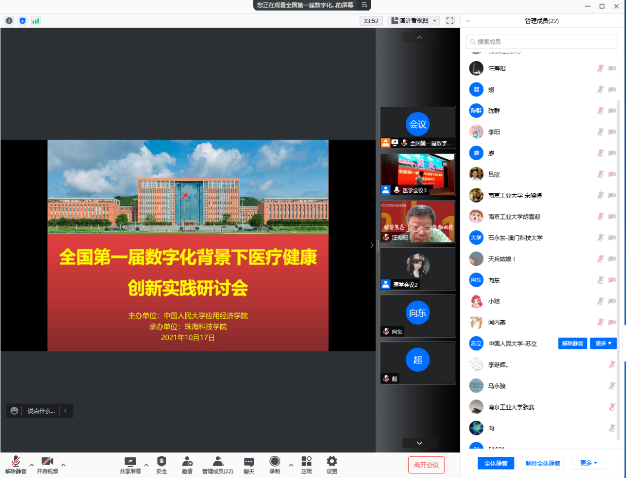 本次会议围绕数字技术赋能医疗健康,针对我国医疗健康产业的发展现状以及不同数字技术的应用场景等,探讨医疗健康数字化发展趋势和应用。根据疫情防控要求,本次会议采取线上线下结合的方式,来自国内高等学校、医疗机构、研究部门等行业的200余位专家学者及在校学生参加会议。会议由珠海科技新葡京官网 院长梁艳春教授和新葡京官网 潘伟教授共同主持。