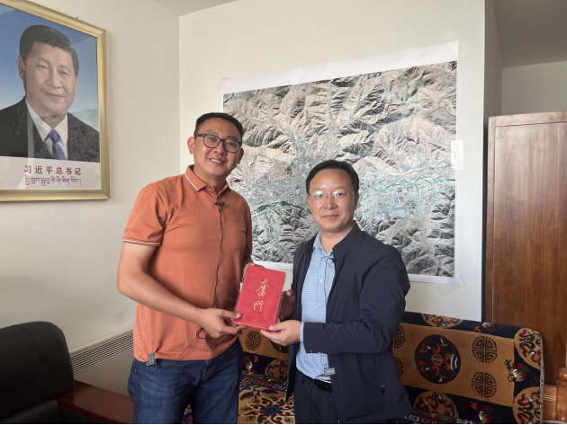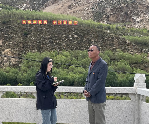 访谈团硕士生任文丽对维巴村党总支书记尼玛进行访谈。尼玛谈到他2013年来到维巴村工作,当时村里生态环境较为恶劣,风沙严重,尼玛走村入户,了解到村民主要收入来源为放牧和政策性收入,生活较为艰苦。为改善村民生活,尼玛规划维巴村未来的发展道路,考虑到维巴村是城关区唯一一个有纯牧业组的村,天然牧场资源丰富,适合走绿色发展的路子。自2014年起,维巴村每年组织村民群众在道路沿线、河道两岸及裸露山体周边义务造林,9年多时间,原本荒芜的山体渐渐浸染了一片又一片新绿,“绿水青山就是金山银山”的理念在这里落地开花。尼玛介绍,在保护生态环境的前提下,维巴村计划发展林卡经济、山地自行车比赛、水磨坊等生态产业,让村民都吃上生态饭、旅游饭。最后,尼玛表示广袤绵延的绿水青山就是维巴村最宝贵的财富,一定要好好保护,并赠与访谈团夺底街道维巴村生态建设的相关影像。