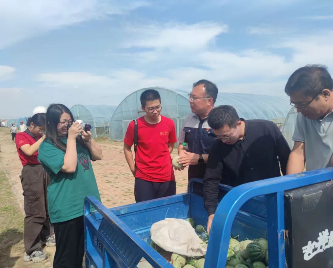 ▲访谈团调研大棚网纹甜瓜、西红柿、哈密瓜种植情况