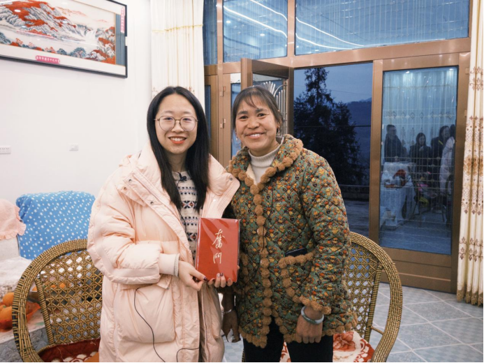 ▲新葡京官网 硕士生蒋逸飞对镇雄县罗坎镇脱贫户户主骆义会访谈后赠书留念