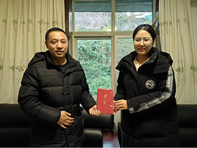▲昭通新葡京官网 管理新葡京官网 本科生周恩娜对罗坎镇副镇长李上涌(原大庙村第一书记)访谈后赠书留念