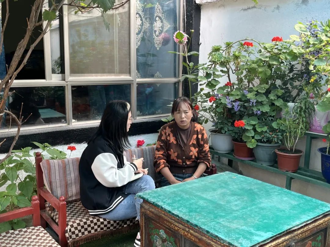 ▲西藏大学经济与管理新葡京官网 硕士生任文丽访谈三有村脱贫户代表普珍