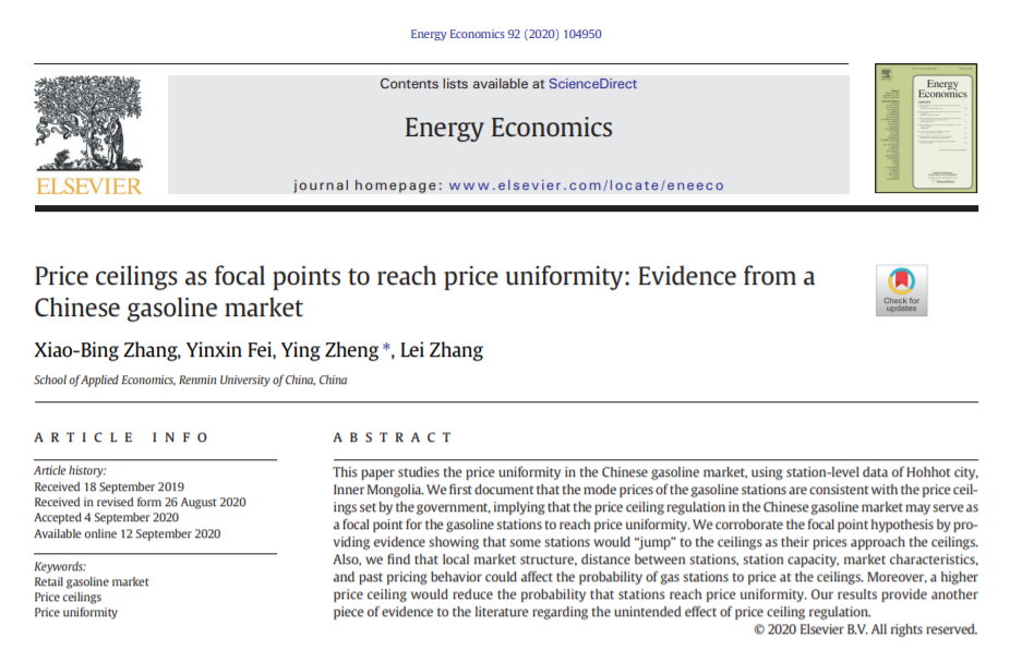 近日,我院张晓兵、郑㼆老师、博士生张蕾和硕士生费吟昕合作的论文《Price ceilings as focal points to reach price uniformity: Evidence from a Chinese gasoline market》被能源经济领域国际权威期刊《Energy Economics》接收发表,这是我院在能源产业组织领域研究的新进展。该论文利用内蒙古呼和浩特市的加油站的价格数据,研究了我国成品油零售市场的定价的一致性问题。与大多数发达国家不同,我国成品油零售市场存在独特的价格上限政策,发改委大约每十个工作日根据国际原油价格和国内加工成本、税金、流通环节费用和适当利润,制定各省市汽、柴油最高零售价格。该研究发现我国实行的汽油零售的价格上限可能成为加油站实现一致定价的一个焦点(focalpoint),从而削弱了加油站之间的价格竞争。另外,该论文还研究了市场结构、加油站之间的距离、加油站容量等市场特征对加油站定价行为的影响。价格管制的目的是防止垄断,保护消费者利益,而该论文提出我国成品油零售市场的价格管制反而有可能会促进厂商间的价格串谋。这对于我国相关能源市场进行价格管制政策的制定具有重要借鉴意义:在制定价格管制政策时,应当考虑到它对市场竞争可能的潜在的负面影响,合理确定价格管制的方式和价格管制水平。