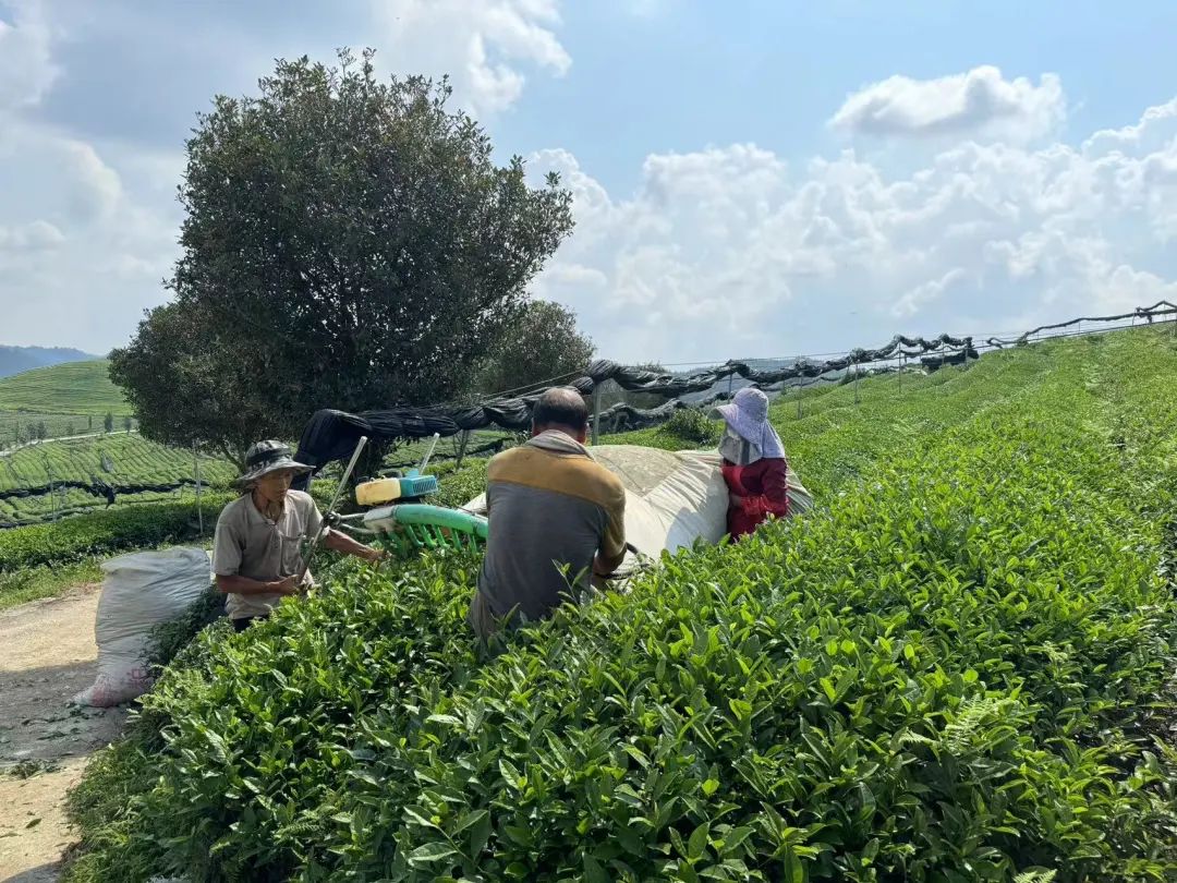 ▲御茶村有限公司茶园内的农户正在用机器采收茶叶