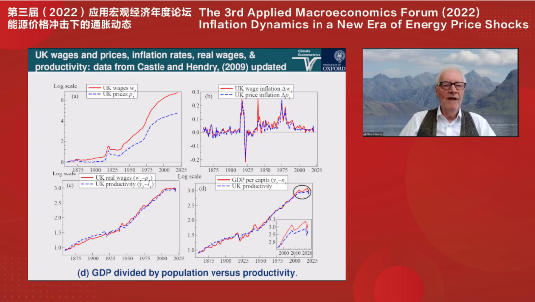 牛津大学纳菲尔德新葡京官网 教授David Hendry作题目为“The Historical Role of Energy in UK Inflation and Productivity and Implications for Price Inflation in 2022”的报告。该研究基于英国一个半世纪以来的数据,分析了价格、工资、生产率和失业率间复杂的相互作用关系。结果表明,尽管能源价格对通胀的直接影响很小,但2022年石油和天然气价格大幅上涨贡献了近一半的通货膨胀,能源供应减少同时降低产出并加剧通货膨胀。研究还发现当年通胀超过约6-8%时,实际工资与价格出现螺旋上升。