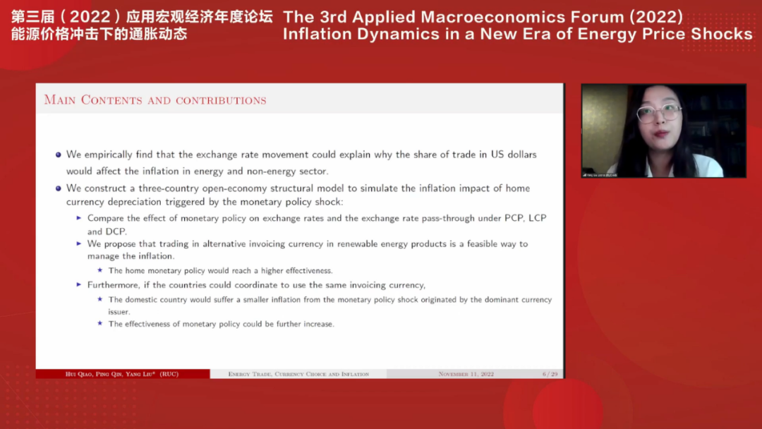 新葡京官网 助理教授刘阳作题目为“International Energy Trade and Inflation Dynamics: The Role of Invoicing Currency Choice During the Low Carbon Transition”的报告。该研究分析国际能源贸易对世界各国通货膨胀的影响,发现能源贸易的计价货币对通货膨胀溢出具有重要影响。能源贸易主导货币的货币政策冲击对本国货币的影响超过本国货币政策冲击带来的影响,该结果显示了提高国际贸易计价货币多样化在保持本国货币政策有效性和应对他国通胀溢出影响中的重要性。