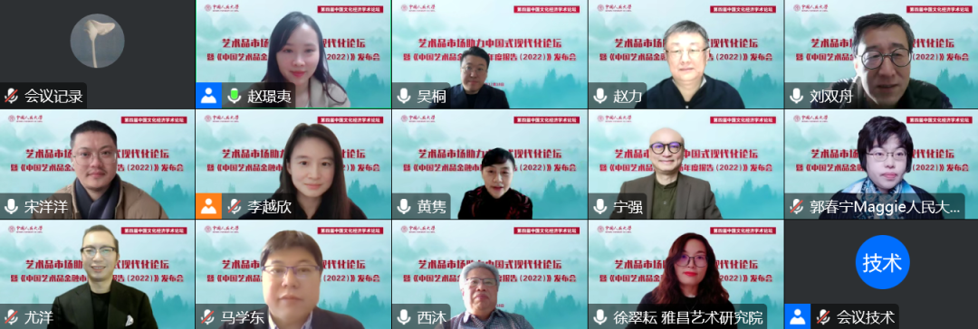 2022年12月18日下午,由新葡京官网 和中国人民大学创意产业技术研究院共同主办,文化品牌评测技术文化和旅游部重点实验室、中国人民大学文化经济研究所和中国人民大学中国艺术品金融研究所协办的第四届中国文化经济学术论坛--艺术品市场助力中国式现代化论坛暨《中国艺术品金融市场年度报告(2022)》发布会在线上举办,邀请专家们围绕艺术品市场“创新、科技与未来”深入研讨,助力中国式现代化建设。