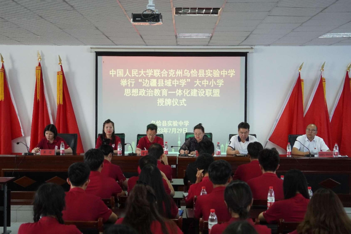 此后,曹新宇老师发表寄语。他表示,中国人民大学是我们党创办的第一所新型正规大学,被誉为“我国人文社会科学高等教育领域的一面旗帜”;乌恰县实验中学,拥有六十年办校历史,始终把铸牢中华民族共同体意识贯穿教学育人全过程。人民大学和乌恰县实验中学合作推进大中小学思想政治教育一体化建设,既是新时代推进边疆教育事业发展的一次生动实践,也是筑牢中华民族共同体意识的有益探索。曹老师发言完毕后,乌恰县人民政府副县长、县委教育工委副书记巴合提古丽•吉恩比发表了讲话。