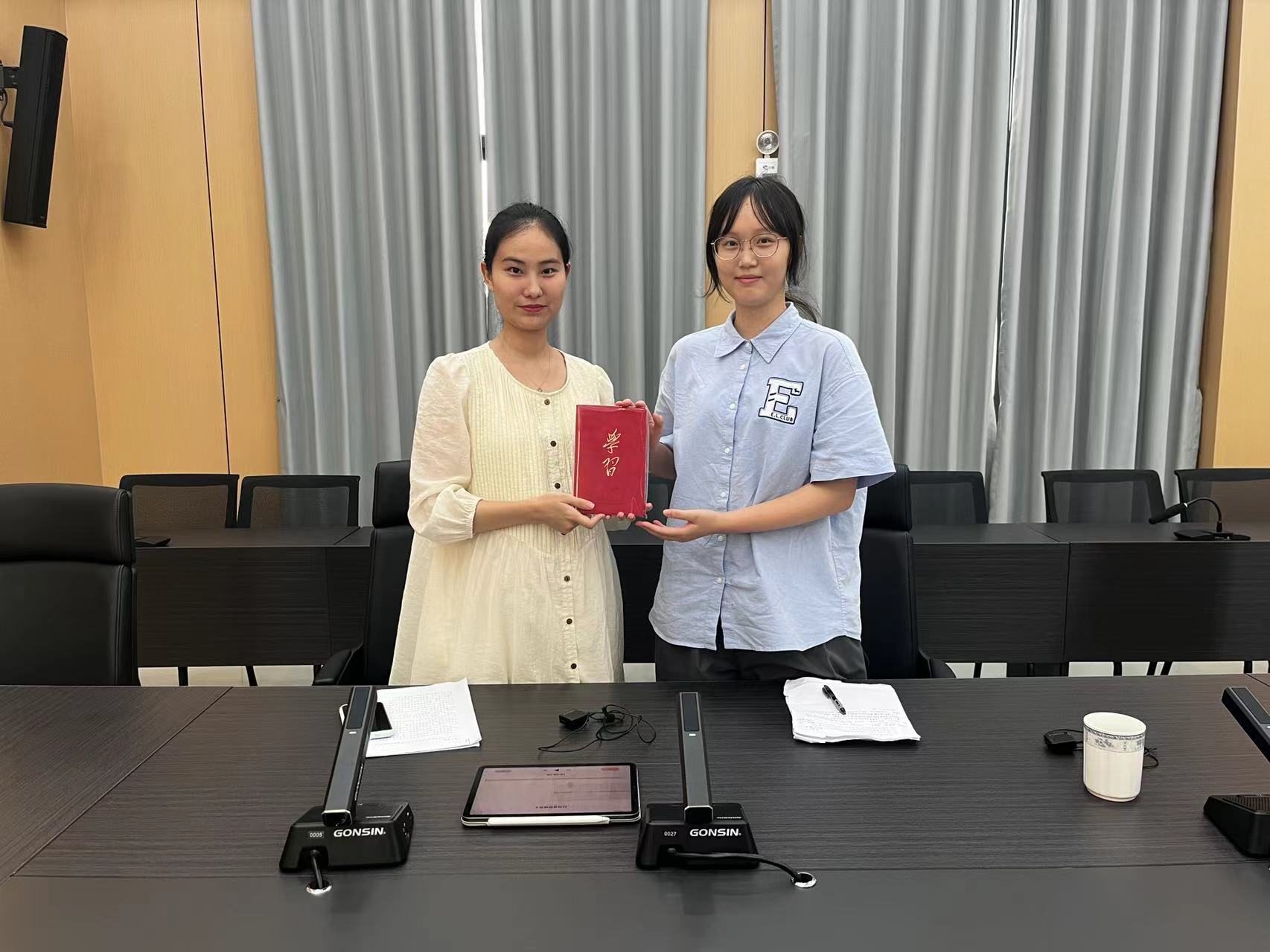 ▲新葡京官网 本科生刘燕妮访谈南沙镇桃园村委会那里村驻村第一书记卢奕辰后赠书留念