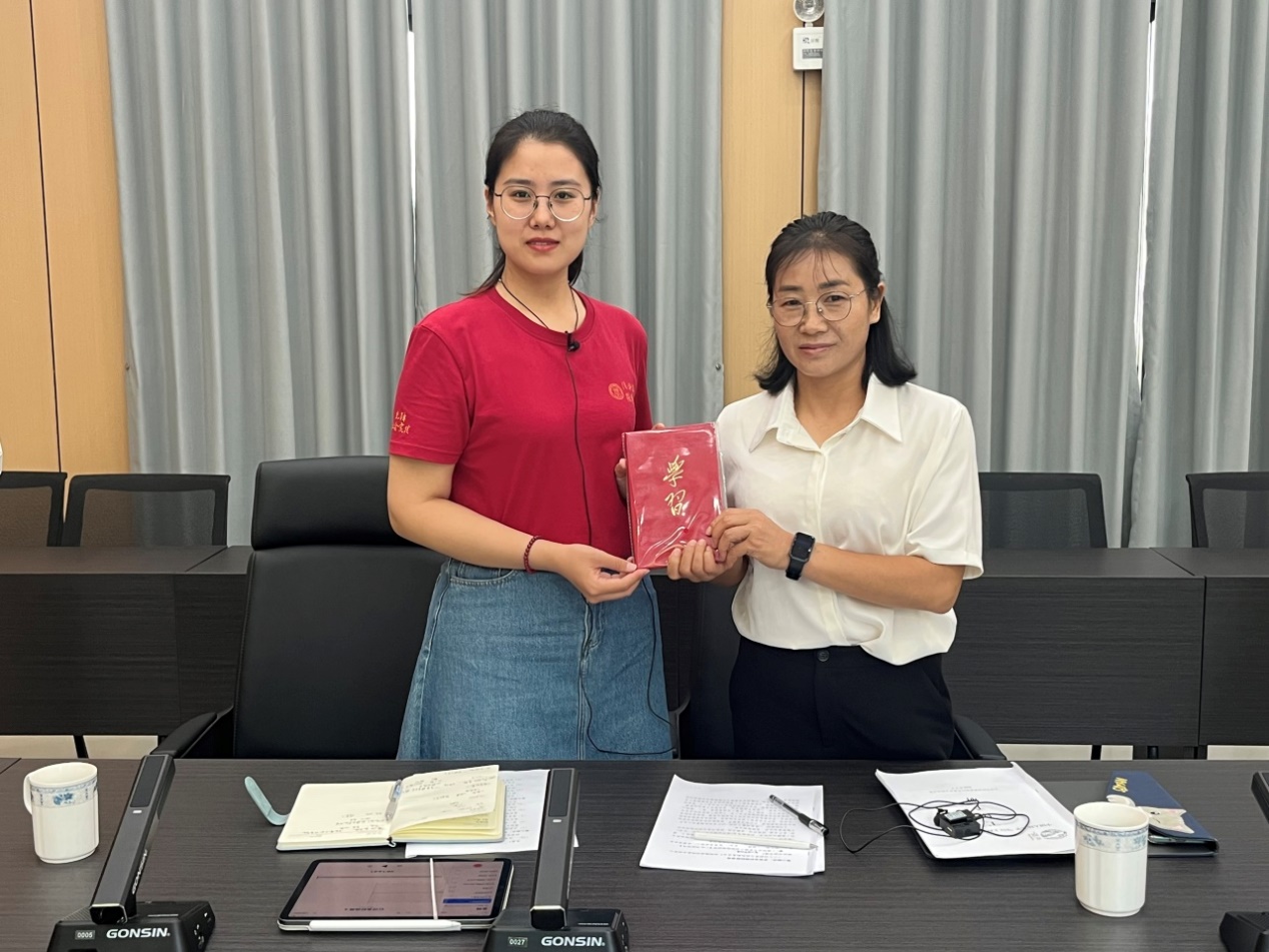 ▲新葡京官网 本科生刘燕妮访谈甲寅镇阿撒村委会驻村第一书记王政后赠书留念