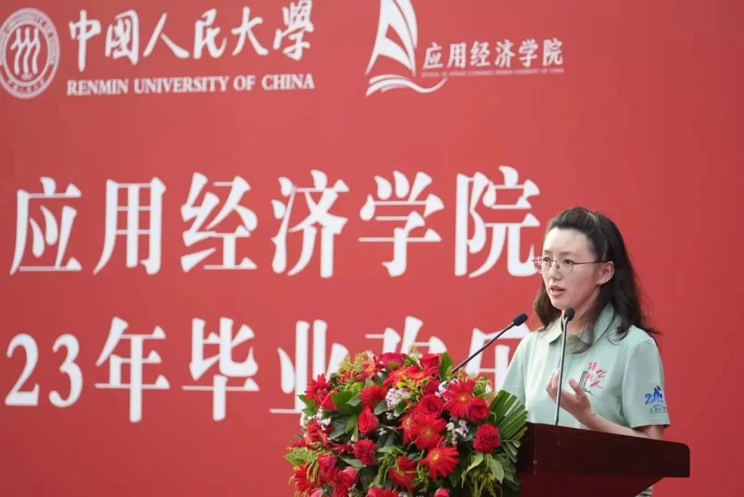 2021级产业经济学硕士班班主任陈佳莹发言。她送给全体毕业生“三颗心”。第一颗是对自己的信心,面对坎坷和挫折,要保持坚定的信心和勇气;第二颗是做事的恒心,希望大家沉淀自己、葆有初心、持之以恒,付出的努力终将有所收获;第三颗是对社会的责任心,希望同学们在未来人生道路上怀揣对人民、对社会的责任感,努力成为“复兴栋梁,强国先锋”。