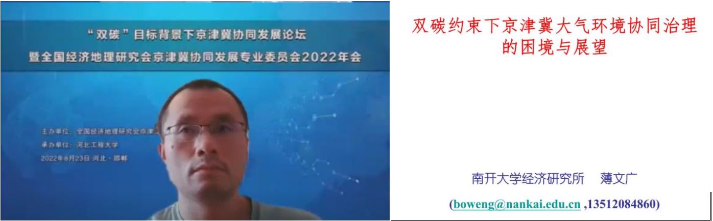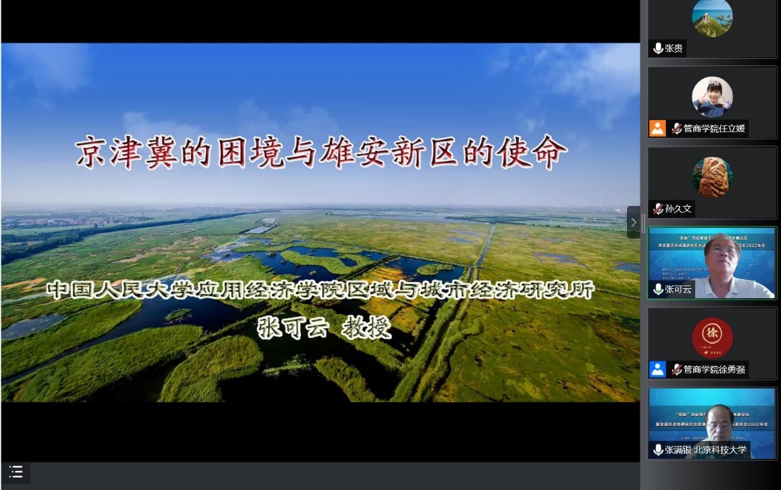 七位全国经济地理研究会京津冀专委会主任委员分别围绕京津冀协同发展的新动能、新机制、新发展和新方法展开了研讨。中国人民大学文余源教授作题为“基于航空流的中国城市群体系网络格局时空演进”的报告,讨论了城市群整体格局和航空布局、城市群体系航空流网络格局及城市群体系空间结构的时空演进特征等,为京津冀协同发展提供了思路。首都经贸大学特大城市经济社会发展研究院副院长叶堂林教授作题为“北京打造数字标杆城市的问题及对策研究”的报告,提出要充分发挥北京数字经济发展优势,为津冀两地数字经济发展提供创新动能。中国社会科新葡京官网 工业经济研究所区域经济室主任叶振宇研究员做了题为“京津冀区域发展这十年的变化探究”的报告,围绕京津冀协同发展中存在集聚外部性规律、公共物品外部性规律、区域治理规律、区域增长规律和区域一体化规律,提出该区域高质量发展的新思考。河北经贸大学经济研究所所长田学斌教授作题为“类市场机制宇京津冀协同深化”的报告,强调要以类市场机制构建主体协同内生长效机制,充分调动政府积极性,破解当前京津冀协同发展面临的市场与政府“双失灵”困境。河北工程大学管理工程与商新葡京官网 院长王彦林教授作题为“双碳目标与乡村振兴的协同推进”的报告,就如何协同推进“双碳”目标与乡村振兴,提出了构建乡村低碳发展工作体系、加大农业碳汇产品供给、建立完善农业碳汇市场、提升农业绿色低碳技术的研发和应用水平、加强专业技术人才支撑、充分发挥村民主体作用等六条有益思路。南开大学滨海开发研究院副院长薄文广副教授作题为“‘双碳’约束下京津冀大气环境协同治理的困境与展望”的报告,探讨了“双碳”约束下京津冀大气环境协同治理存在的四大困境,并提出了精准搭配不同政策手段、强化经济和社会可行性评估、优化相关考核和问责制度等对策建议。南开大学京津冀协同发展研究院秘书长张贵教授作题为“数字经济助力京津冀协同发展”的报告,强调数字经济对京津冀产业一体化发展的特殊作用,同时提出了确立数字经济发展指引战略目标、加快数字经济区域产业链构建、推进京津冀工业互联网协同发展、发挥京津冀数字经济联盟作用,推动有效市场和有为政府更好结合等系列对策建议,为数字经济如何助力京津冀协同发展提出了新思路、新对策。