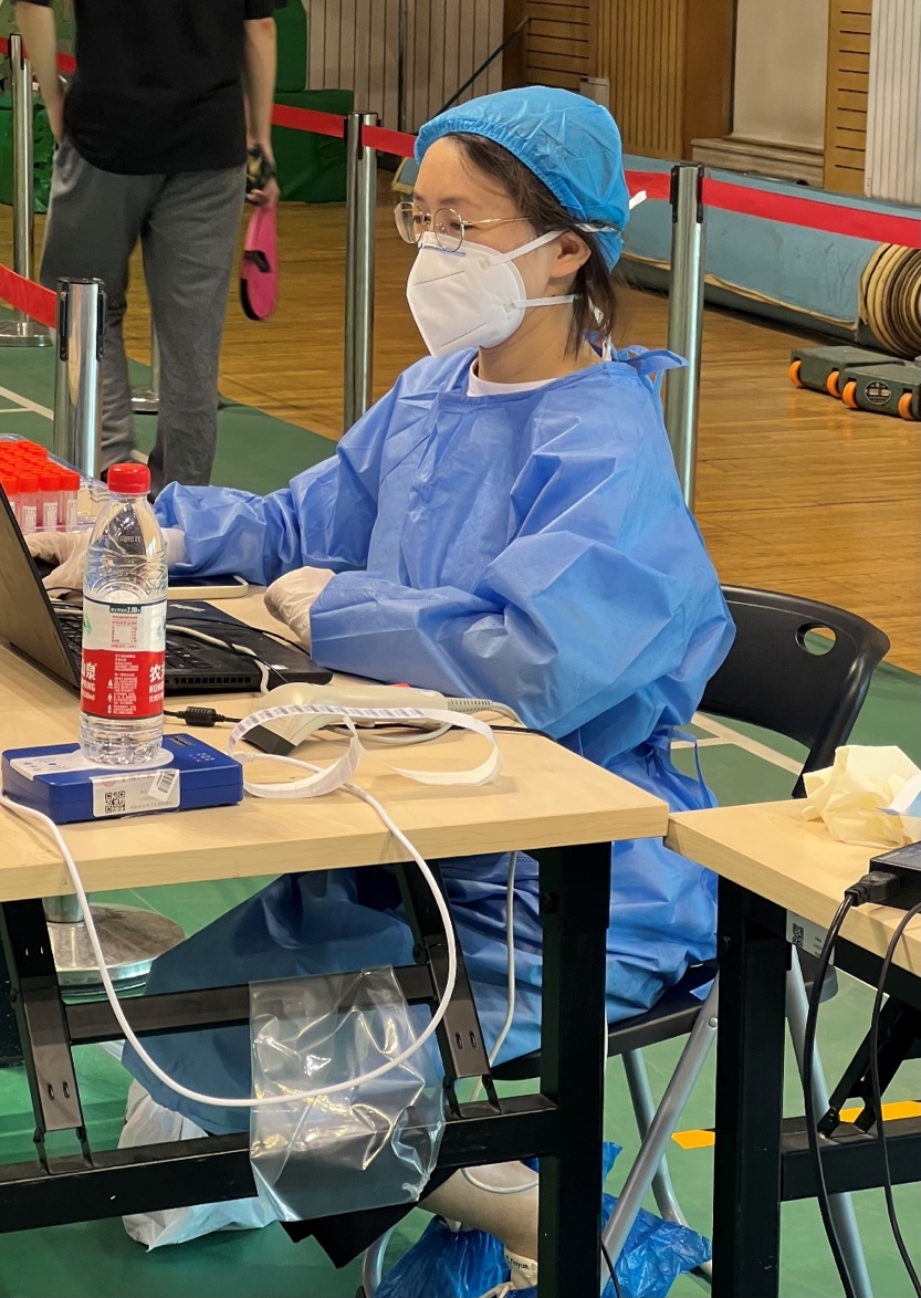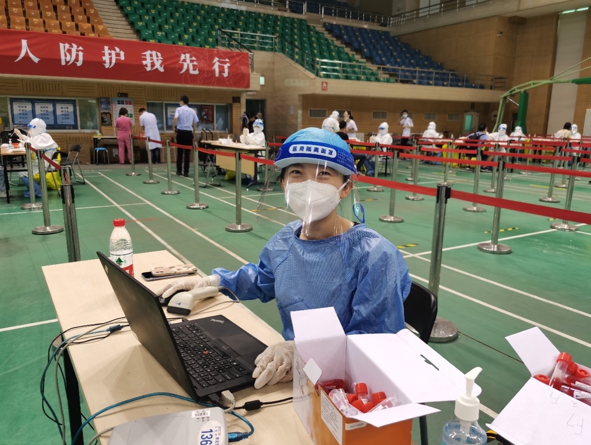 (陈佳莹老师参加学校核酸检测志愿者的现场照片)
