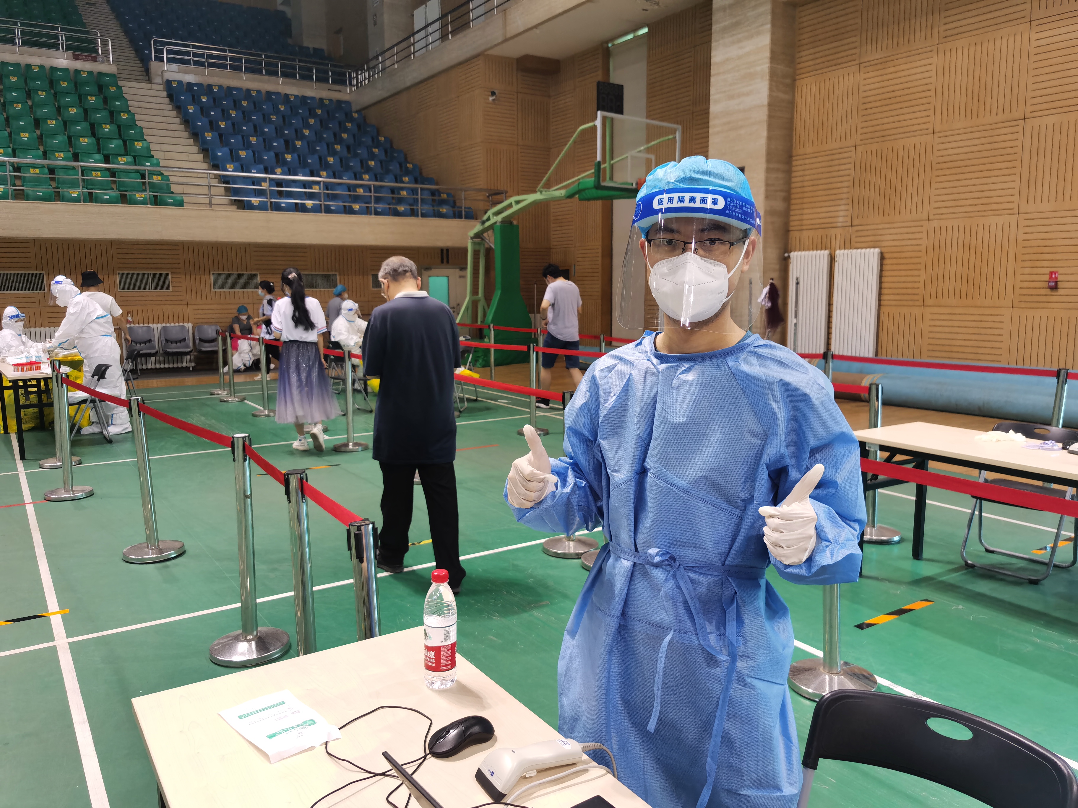(刘逸楠老师参加学校核酸检测志愿者的现场照片)