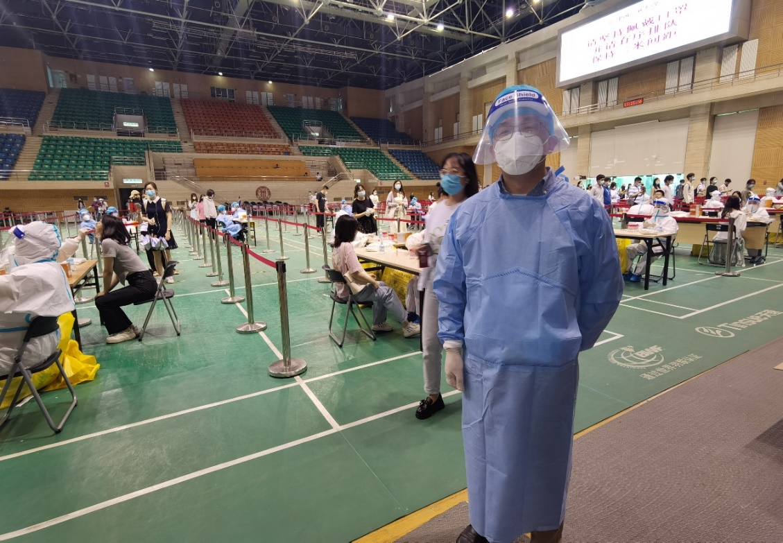 (陈浩老师参加学校核酸检测志愿者的现场照片)