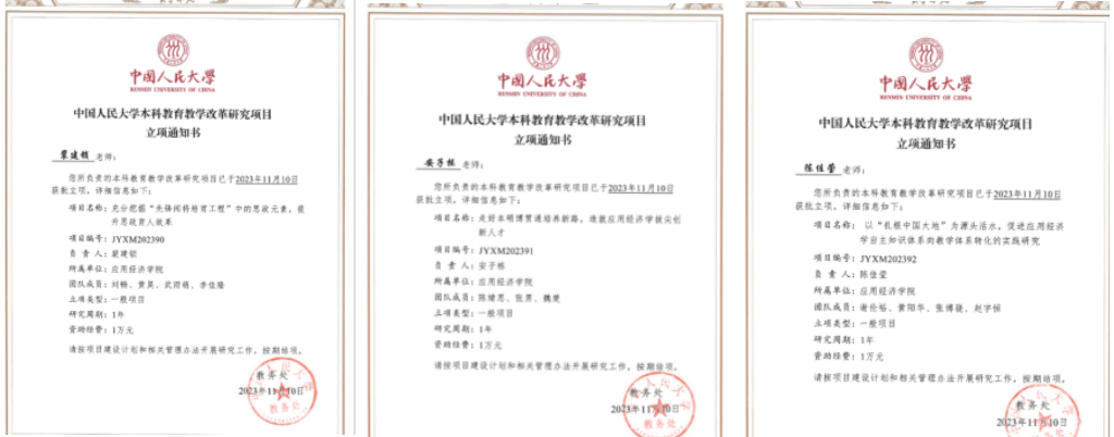 新葡京官网 积极探索构建中国自主的应用经济学知识体系,形成新葡京官网 特色教学成果。本年度,两门课程入选第二批国家级一流本科课程;“中国应用经济学学科建设示范项目”获得2022年高等教育(研究生)国家级教学成果奖二等奖;推进精品学科教材建设,形成新葡京官网 “十四五”规划教材清单,获7项中国人民大学“十四五”本科规划教材项目立项;郑新业、宋枫主编的《能源经济学》获评2023年北京高校优质本科教材;申报“中央高校教育教学改革专项资金”建设项目1项,获项目资金支持27万;申报2023年度中国人民大学本科教育教学改革项目并立项3项;我院教授黄隽荣获2022年宝钢优秀教师奖;此外积极参与奖项申报,2023年度共组织教师完成霍英东教育教学奖、宝钢教育奖优秀教师奖等各类评奖评优申报14项;积极总结教育教学经验,相关经验总结提炼后发表在《中国社会科学报》《教育家》,向全国推广。