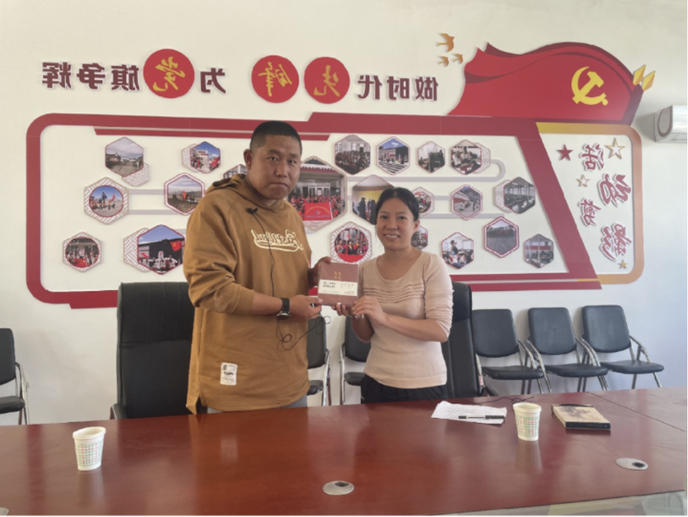 ▲访谈团博士生王漫玉访谈桑珠孜区江当乡郭加新村驻村工作队队长普布多吉