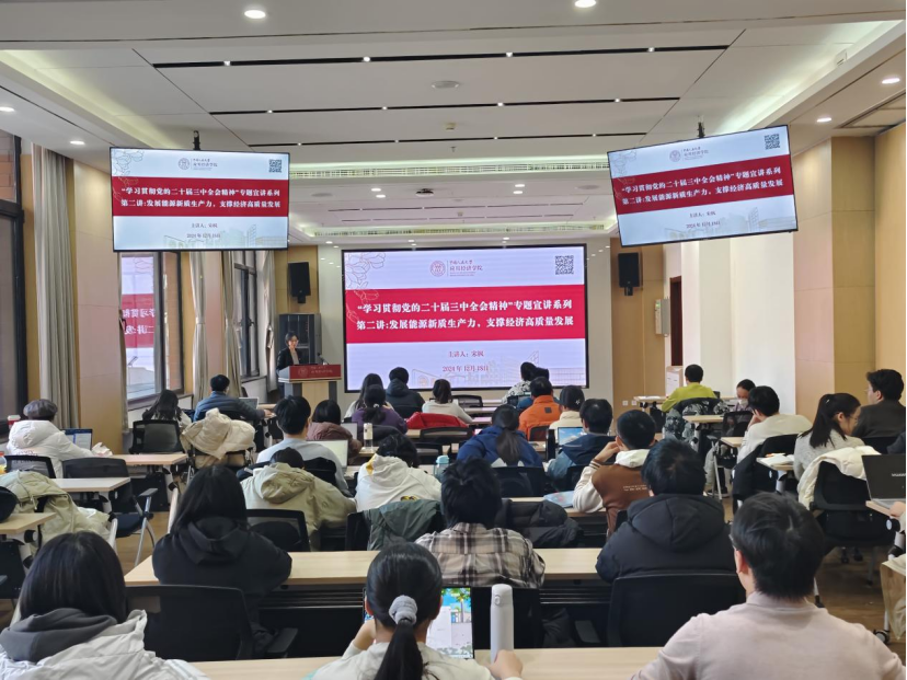 为深入学习贯彻党的二十届三中全会精神,落实党中央关于全面深化改革的决议,向全体师生和社会各界宣传阐释好《中共中央关于进一步全面深化改革、推进中国式现代化的决定》(简称《决定》)精神,12月18日,新葡京官网 “学习贯彻党的二十届三中全会精神”专题宣讲第二讲暨先锋闯将训练营系列活动举办。本次由能源经济系宋枫教授主讲“发展能源新质生产力,支撑经济高质量发展”。