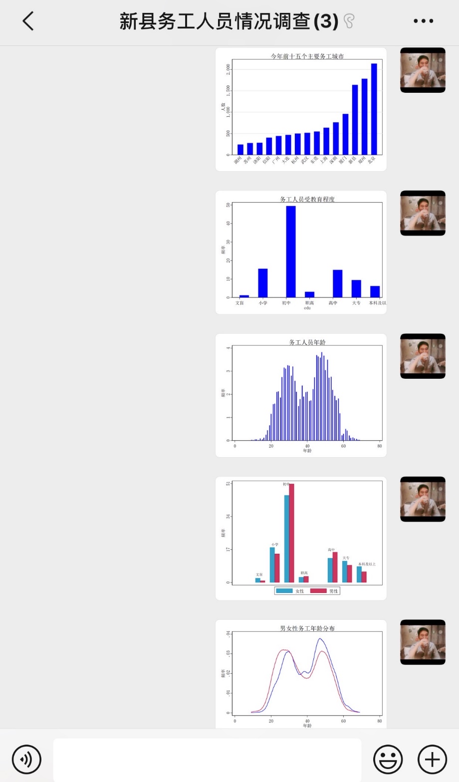 这次疫情也打破了我到河南省新县挂职一名基层干部的计划,我想,在这种情况下我无法到抗疫一线,但我仍然可以发挥一定的作用,为当地政府和群众做些什么。后来我得知新县需要对县内所有务工人员进行一次摸底,以便进行相关工作部署。于是,我配合新县疫情防控指挥部开展了关于新县务工人员情况的调查,调查的主要目的是摸清新县务工人员尤其是贫困人口本年度的工作计划以及劳动技能。我每天都要更新数据,做好数据清理和数据分析,每天中午十二点和每天晚上八点,都准时向新县疫情防控指挥部汇报各乡镇以及各村的信息采集进度、群众对政府工作的建议。除此之外,对于县委县政府关切的问题,我积极回应,及时地加入调查问卷当中,并以恰当的形式呈现给新县疫情防控指挥部以及扶贫办,帮助他们进行疫情防控和稳定就业的科学决策。虽然我没有机会像医护人员那样到抗疫一线,但是我衷心地希望自己的一番努力能够为民生福祉贡献力量。