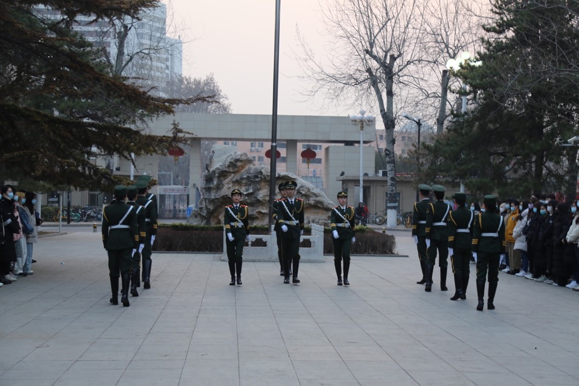 随着指挥员一声“全体肃立,出旗”,气宇轩昂的护旗手们迈着整齐的步伐踏入广场中央,并迅速在两侧列队,指挥员开始宣读国旗法。一抹鱼肚白自天边亮起,嘹亮的国歌声从广场上响起,“起来,不愿做奴隶的人民……”。歌声中饱含着应经学子的爱国赤子之心。