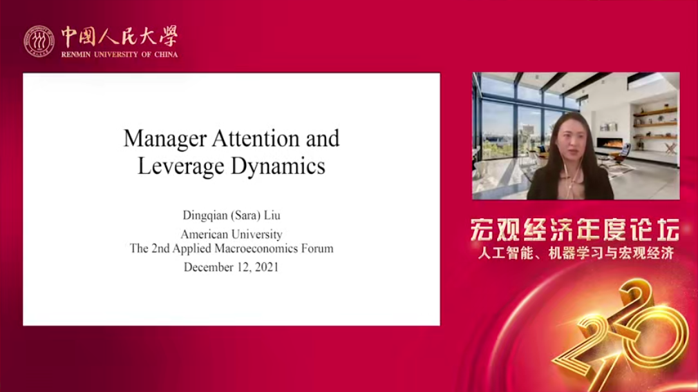 第二篇报告来自美利坚大学客座教授刘玎倩,报告主题为“管理者注意力和杠杆动态”。刘玎倩的研究分析了管理者的注意力以及杠杆动态。大数据时代,涉及人工智能的运算和机器学习,只能借助技术和海量数据进行实验。在海量数据中,管理者如何做决策是值得关注的一点。该研究主要关注管理者的财务决策,具体关注的指标为杠杆率。该研究对注意力的能力和分配进行测量,并提供明确的注意力能力的函数,接着分析管理者对于宏观经济冲击的变化以及在此过程中注意力能力和分配的变化和与杠杆率的关系。研究发现,高的注意力总量会带来更高的杠杆率,管理者注意力高则会通过学习新的东西来了解周围的环境。同时从精力分配的角度来看,管理者可能更多关注宏观经济,降低杠杆率。