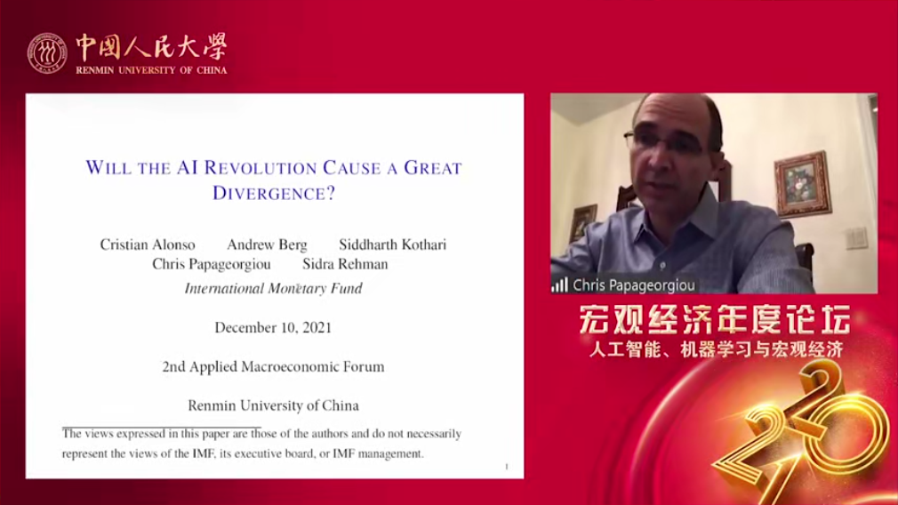本会场首先由来自国际货币基金组织的Chris Papageorgiou,发表以“人工智能革命是否会导致大分化?”为主题的主旨演讲。Chris Papageorgiou的研究分析了人工智能革命是否会导致大分化。过去两到三年中,学界对于技术的关注主要来自于人工智能的新浪潮,很多新闻报道以及研究成果都显示了技术的双重影响。在此背景下,该研究通过设置一个简明的模型,对发达国家和发展中国家进行对比研究,分析了人工智能是否会导致未来全球经济的大分化。研究发现,在机器人代替劳动力的情况下,发达国家和发展中国家的差距在逐渐变大。从宏观角度对该研究做总结,可以得出,技术一方面可以带来现象级影响,可以给发达国家、新兴国家带来很多机会,而对于发展中国家尤其是以非技术工人为主导的国家,技术可能也会带来贫富差距等负面的影响。