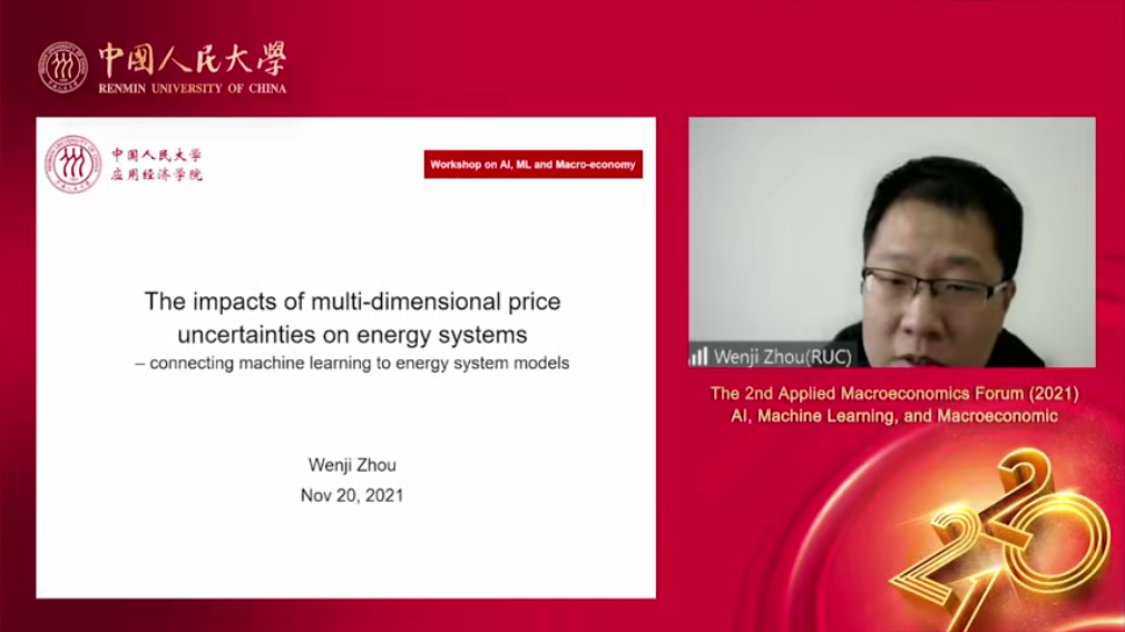 第一篇文章的报告者为新葡京官网 副教授周文戟,报告题目为“价格多维不确定性对于能源系统的影响”。周文戟把机器学习和系统模型结合到一起,讲述了价格多维不确定性对能源系统的影响。周文戟简要介绍了自己的研究动机及背景,并对相关的能源化工产品的背景知识进行了阐述。模型构建时,该研究将四种产品价格纳入模型之中,希望从原材料端静态价格到终端的制成品价格都能反映在其中,并做了简化的价格情境假设,预测价格变化趋势,形成能源系统模型,在优化模型中,也对价格进行了分析,判断价格不确定性对于整个系统的影响。对该研究进行总结时,周文戟教授认为在宏观能源体系中还有很多不确定性,包括能源市场、社会经济发展和长期增长等。我们应该去应用机器学习来识别,预测多维度不确定性的可能性,同时更好地理解宏观能源体系和宏观经济体系之间的互动。