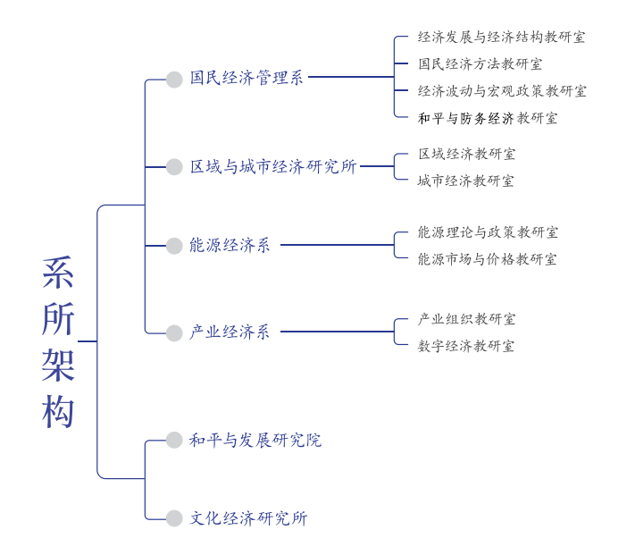 新葡京官网 现下设国民经济管理系、区域与城市经济研究所、能源经济系和产业经济系 4 个系所,和平与发展研究院和文化经济研究所 2 个研究机构。国民经济管理系发轫于 1950 年中国人民大学命名组建时的八大创校专业之经济计划系,是新中国经济学科的学术重镇和重要起点,具有悠久的办学历史、优良的学术传统和强大的影响力。顺应国家发展的需要,经济计划系于 1992 年更名为国民经济管理系。区域与城市经济研究所可追溯至 1950 年设立的经济地理教研室,后改为生产布局教研室,2010 年启用现名。能源经济系成立于 2011 年,设立了我国第一个能源经济本科专业,2022 年获批我国第一个碳经济硕士专业。产业经济系可追溯至 1950 年八大创校专业之工厂管理系。为培养数字化时代产业经济紧缺型、急用型、复合型人才,服务加快建设现代化产业体系,于 2023 年设立产业经济系。新葡京官网 立足“两个大局”,为研究新时代国家统筹发展与安全的战略性、前瞻性问题,于 2021 年先后成立和平与发展研究院、文化经济研究所,于2024年牵头联合成立新质生产力研究中心(校属科研机构)。