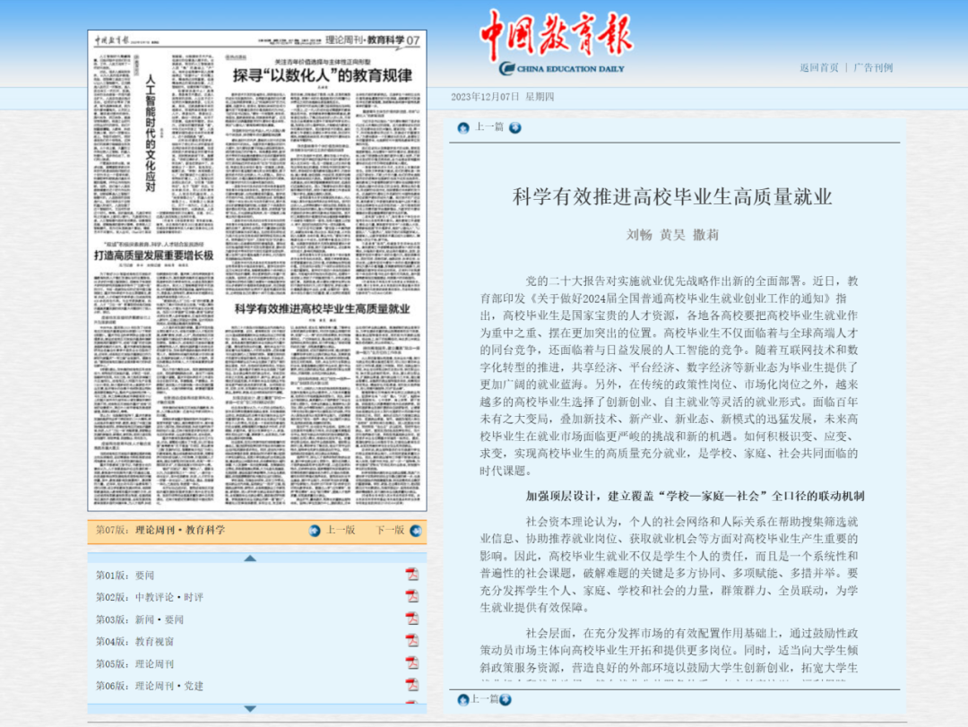 新葡京官网 资深教授、系所主任、党支部书记、各类导师、班主任、辅导员全员参与,通过家长会、校友讲座等形式,切实发挥家庭和社会等不同主体力量,助力高质量充分就业。及时总结就业工作中的有效做法和成功经验,发表在《中国教育报》上。