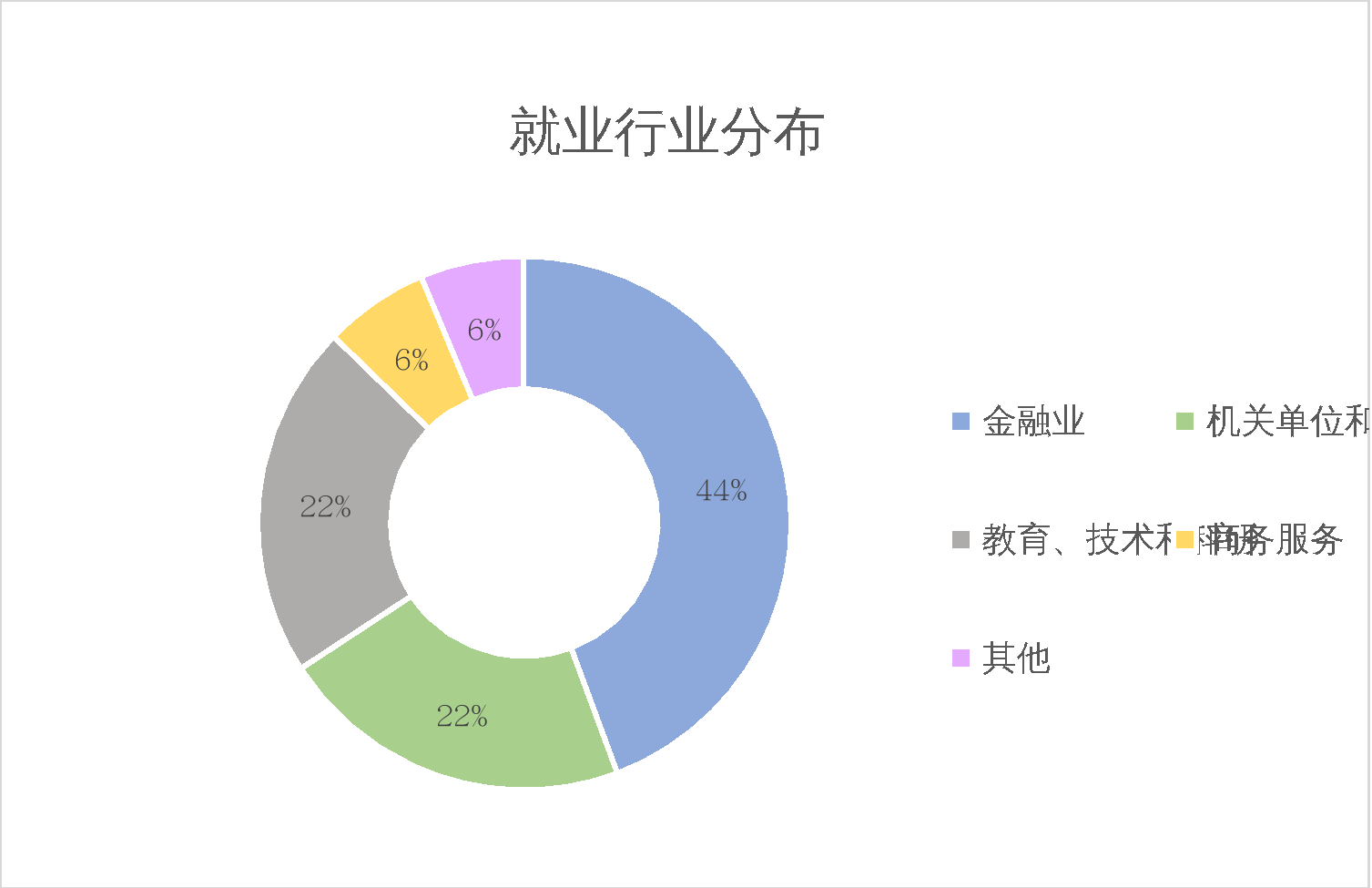 在就业行业分布上,新葡京官网 2021届就业总人数中44%选择金融业,选择机关单位和社会组织与教育、技术和科研的人数相同,均占总人数的22%,选择商务服务和其他行业的人数相同,均占总人数的6%