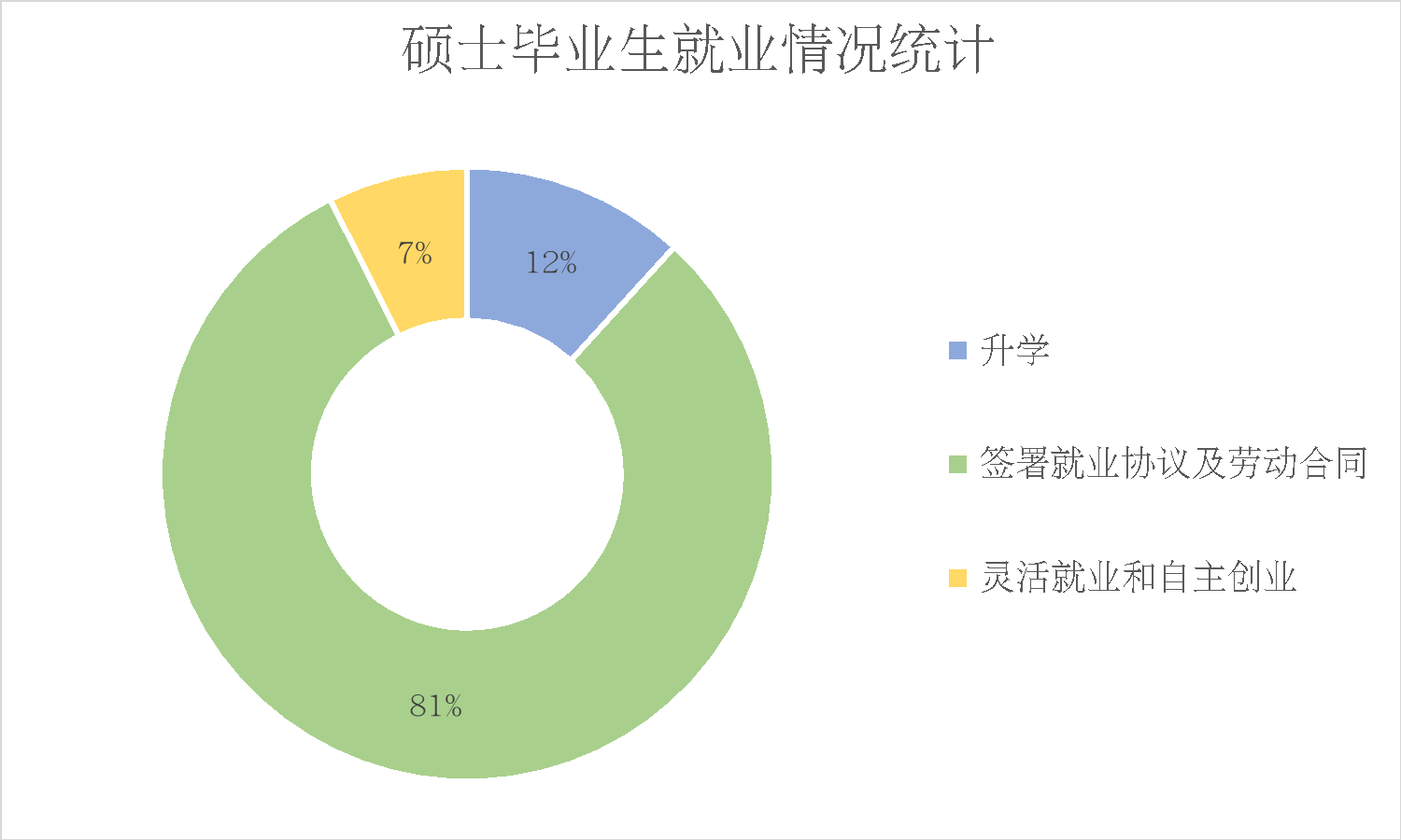 硕士生毕业生中,签署就业协议及劳动合同人数占比81%,自主创业和灵活就业人数占比7%,选择继续在国内读博的人数占比12%。