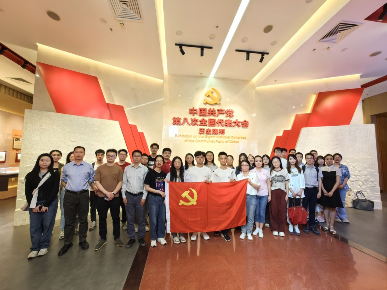 在讲解员的带领下,支部成员参观了中国共产党第八次全国代表大会历史陈列展。展览详细还原了中共八大召开时的历史场景,全景式反映了中国共产党为开辟一条适合中国国情的社会主义建设道路而进行的积极探索。在“大会准备”部分,同学们认真学习中共八大召开时的国内外背景、《论十大关系》等大会筹备的重要内容;在“大会召开”部分,大家近距离参观了毛泽东同志起草的开幕词大纲、主席团名单、中共八大召开时现场录像等珍贵文件和历史影像;在“大会意义和影响”部分,通过图片图表、视频档案、沙盘实物等方式的学习,大家对“中共八大对社会主义改造基本完成以后国内的主要矛盾作出了科学的判断”的重要意义有了更加深刻的理解。