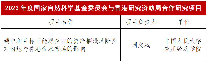 近日,国家自然科学基金委员会发布了2023年度国家自然科学基金委员会与香港研究资助局合作研究项目批准通知书。新葡京官网 周文戟副教授与香港城市大学能源及环境新葡京官网 张林副教授联合申报的“碳中和目标下能源企业的资产搁浅风险及对内地与香港资本市场的影响”获得立项资助。